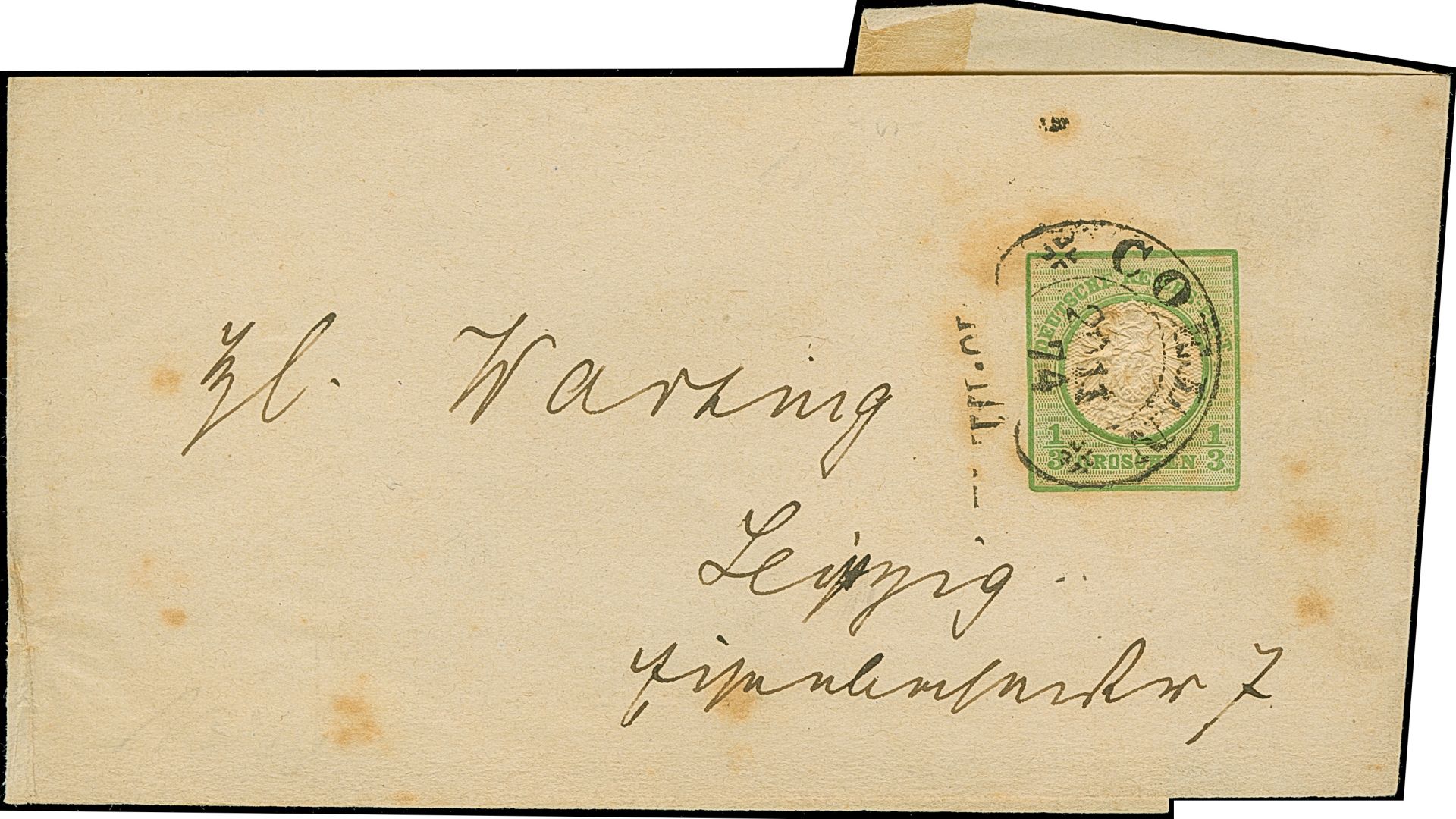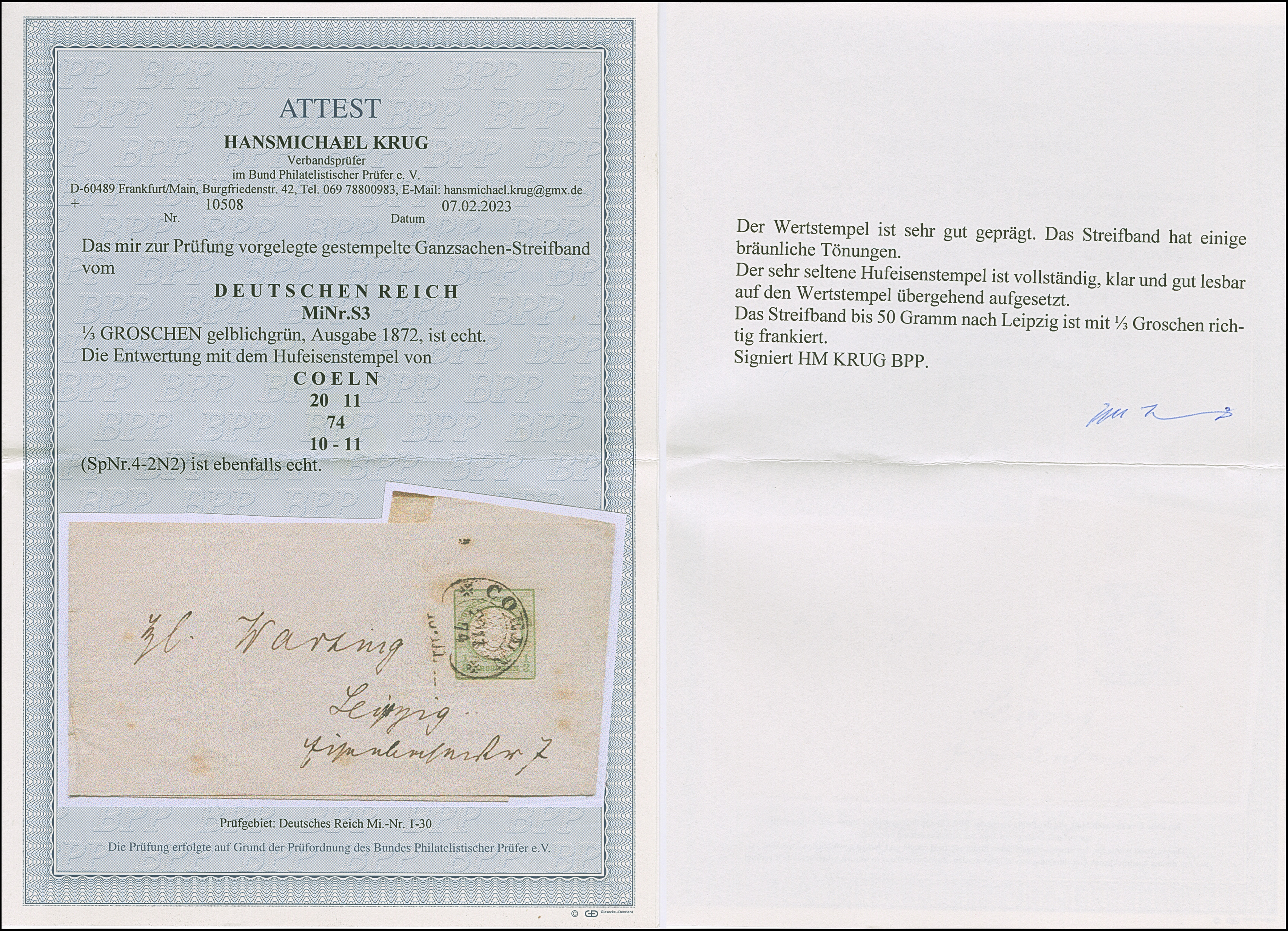 “COELN 20.11.74” (Spalink 4-2N2) klar auf Ganzsachen-Streifband großer Schild ⅓ Gr. nach Leipzig. Das Streifband mit Gelbflecken, ansonsten in guter Erhaltung. Belege aus der Briefpost sind mit dieser Stempeltype außerordentlich selten, signiert Krug BPP mit Fotoattest (2023)