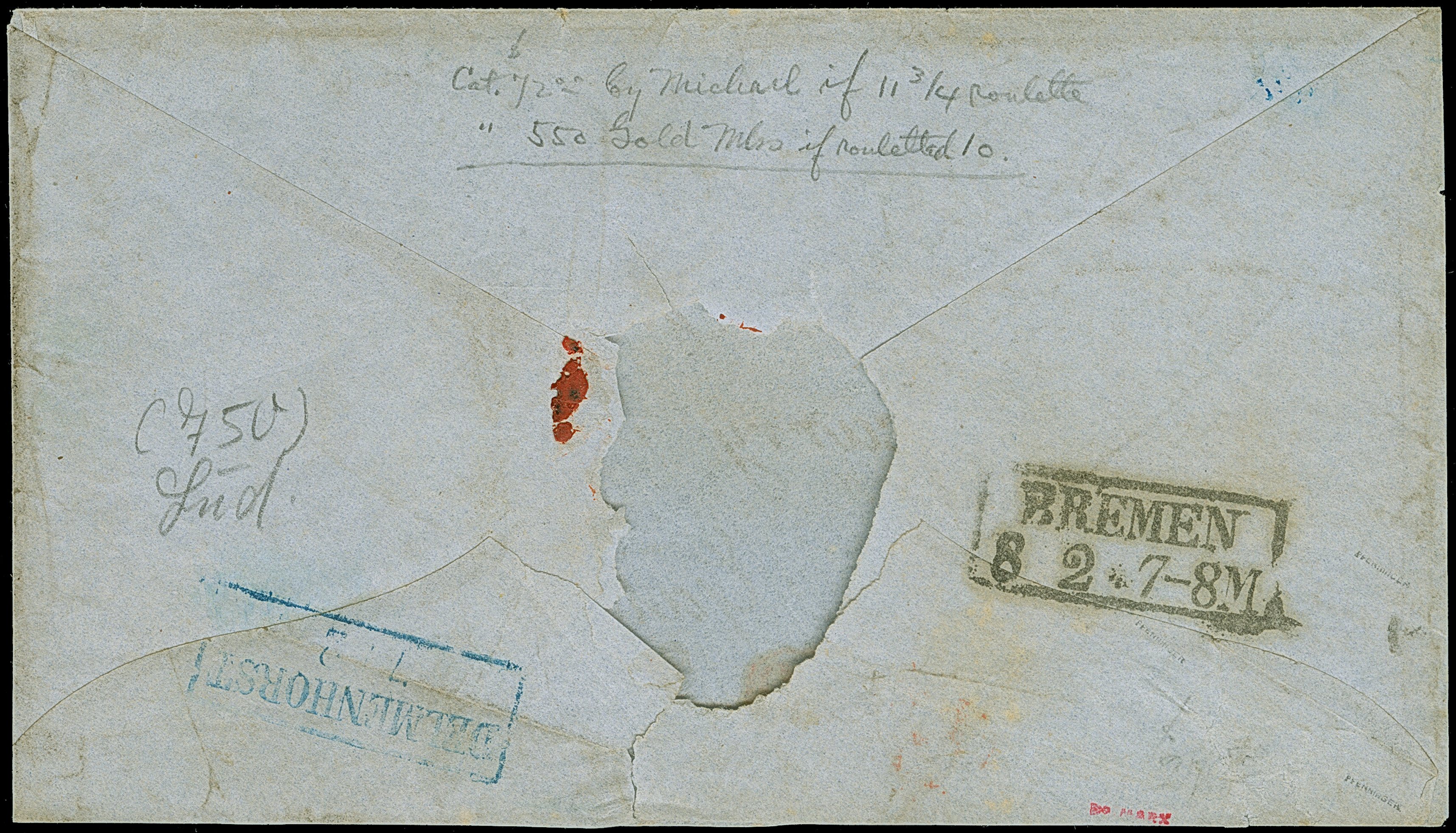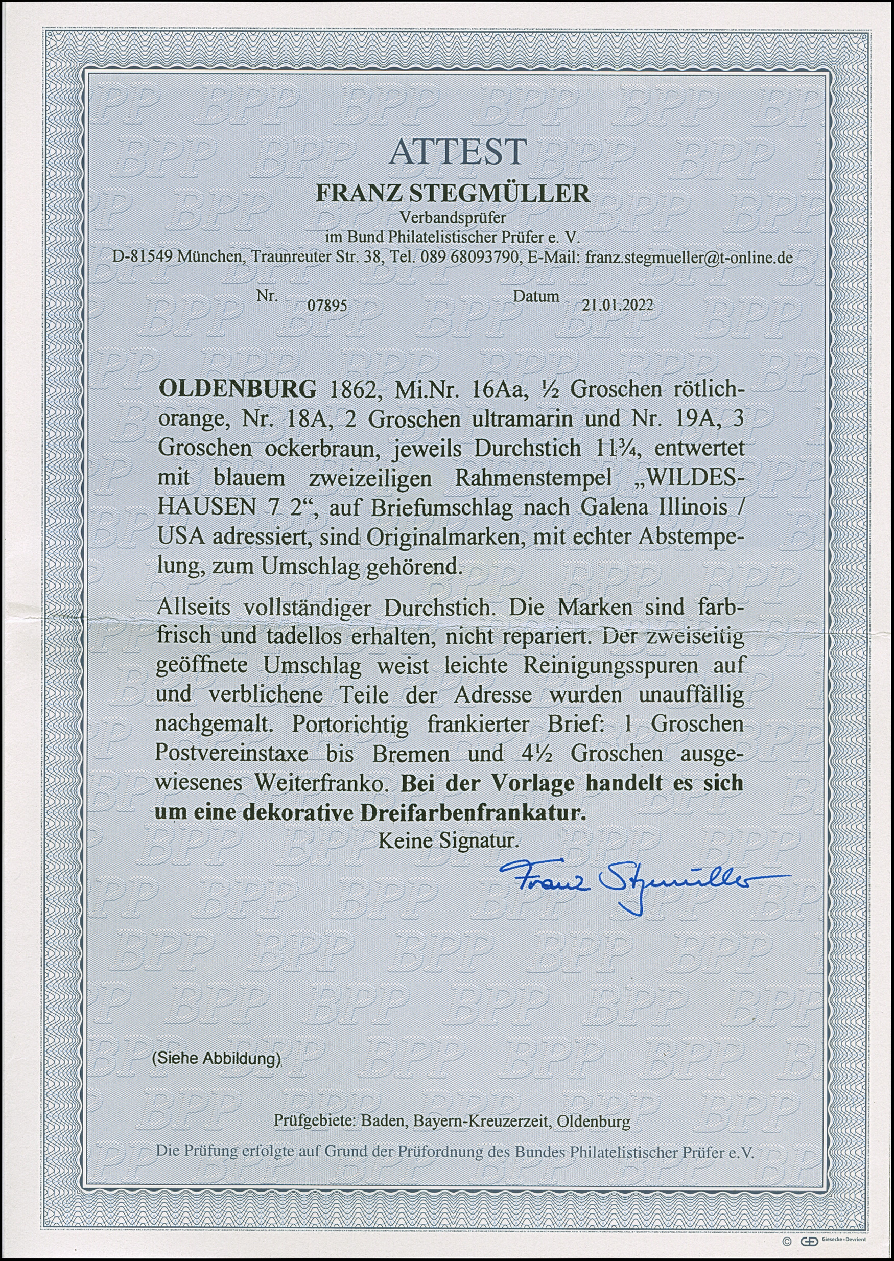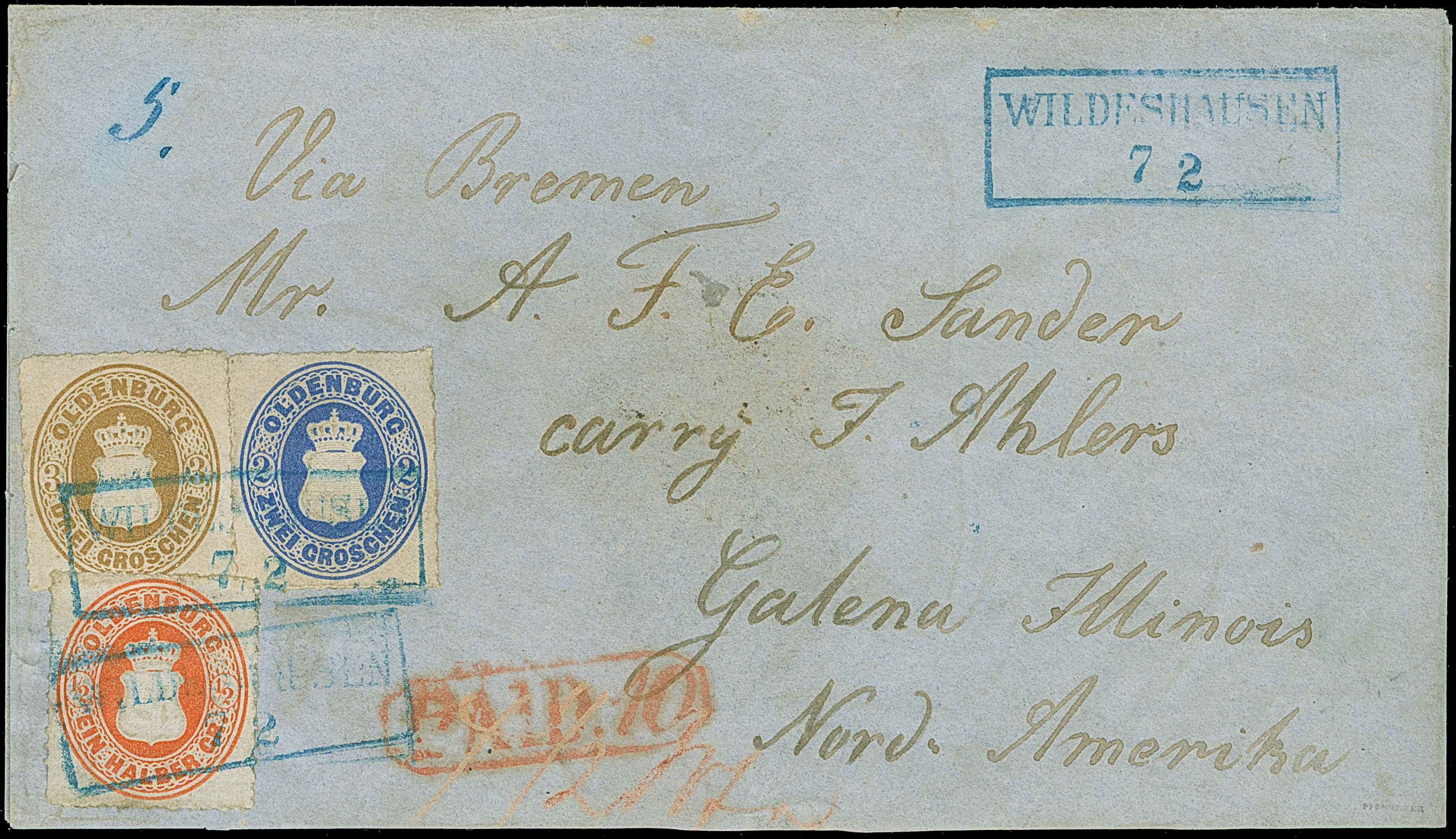 ½ Gr. rötlichorange, 2 Gr. ultramarin und 3 Gr. ockerbraun je mit Durchstich 11¾ und blauem Rahmenstempel “WILDESHAUSEN 7.2." als tarifgerechte Frankatur auf Briefkuvert via Delmenhorst und Bremen mit rotem Ra1 “PAID.10” und Weiterfranko-Vermerk “4½ Wf” nach Galena, Illinois. Der Umschlag mit leichten Reinigungsspuren, Teile der Adresse wurden nachgemalt, und der Umschlag ist zweiseitig geöffnet mit rückseitig ausgeschnittenem Lacksiegel. Die farbfrischen Marken haben allseits einen vollständigen Durchstich und sind in tadelloser Erhaltung. Eine dekorative und seltene Buntfrankatur aus bekannter Korrespondenz mit Destination USA, Fotoattest Stegmüller BPP (2022)