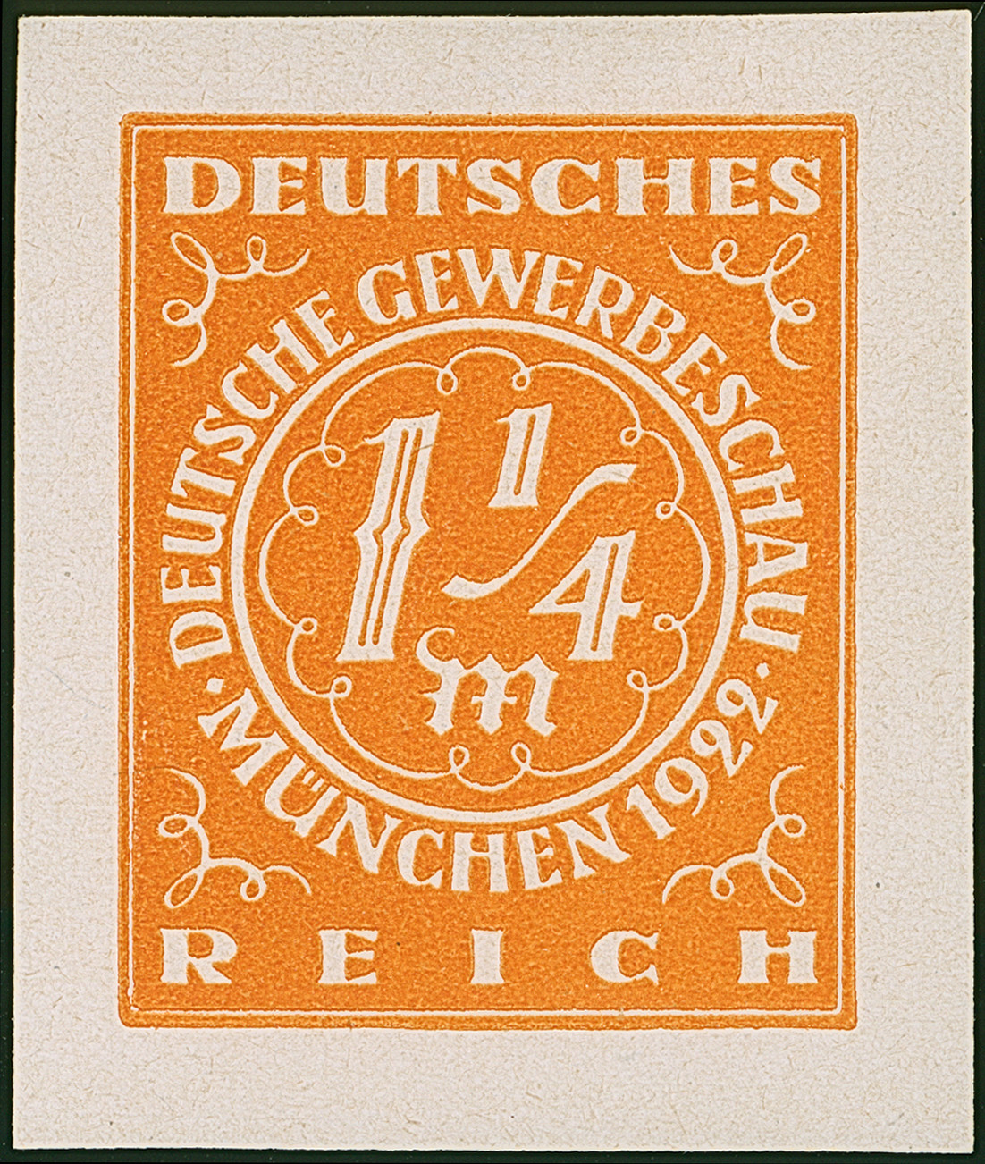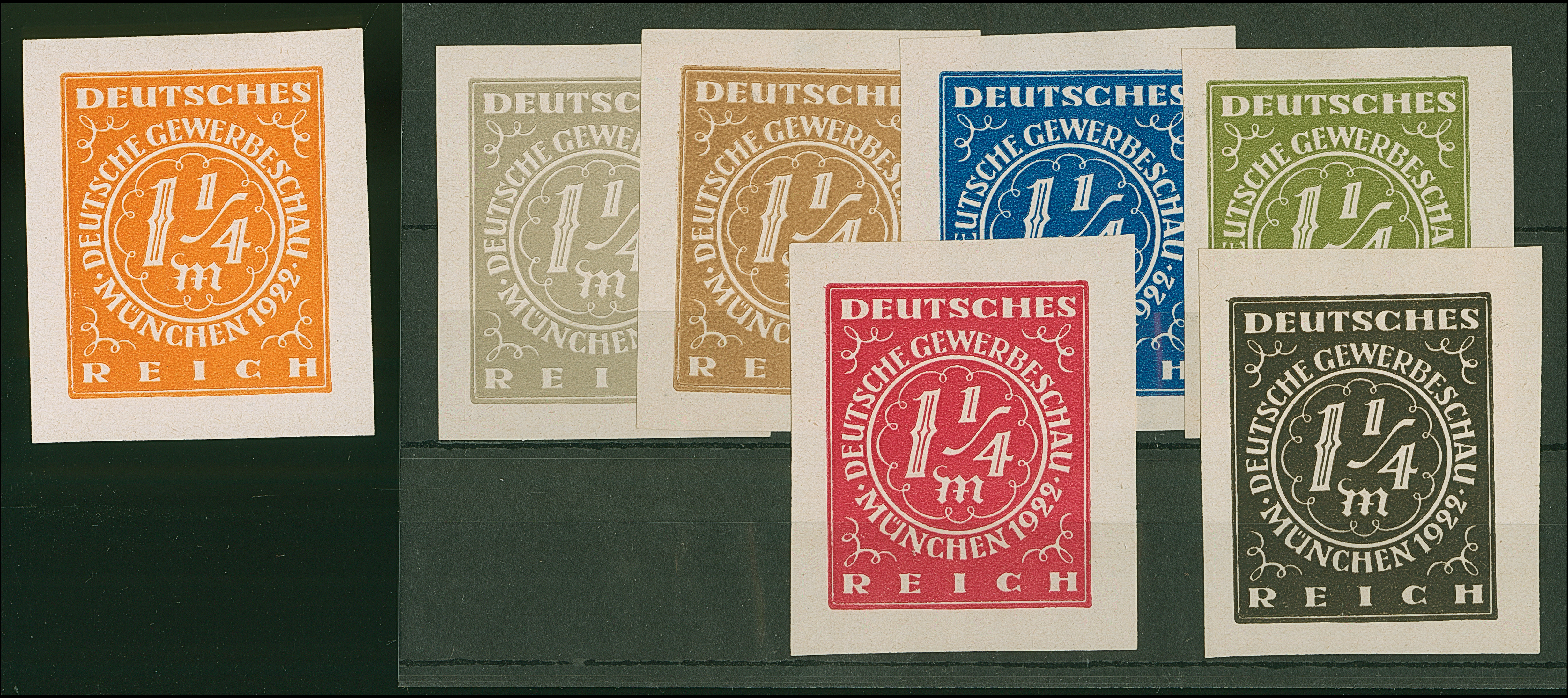 1922, Gewerbeschau München 1 ¼ Mark, sieben verschiedenfarbige ungezähnte Essays im Großformat auf Kunstdruckpapier ohne Gummierung, Falzrest, nach einem Entwurf von S. von Weech, in tadelloser Erhaltung
