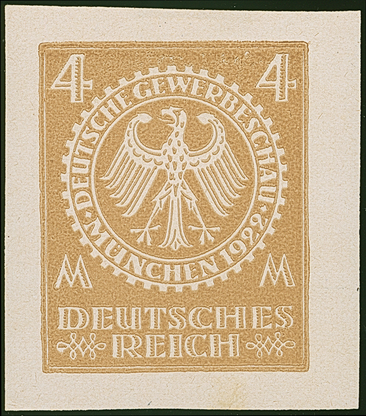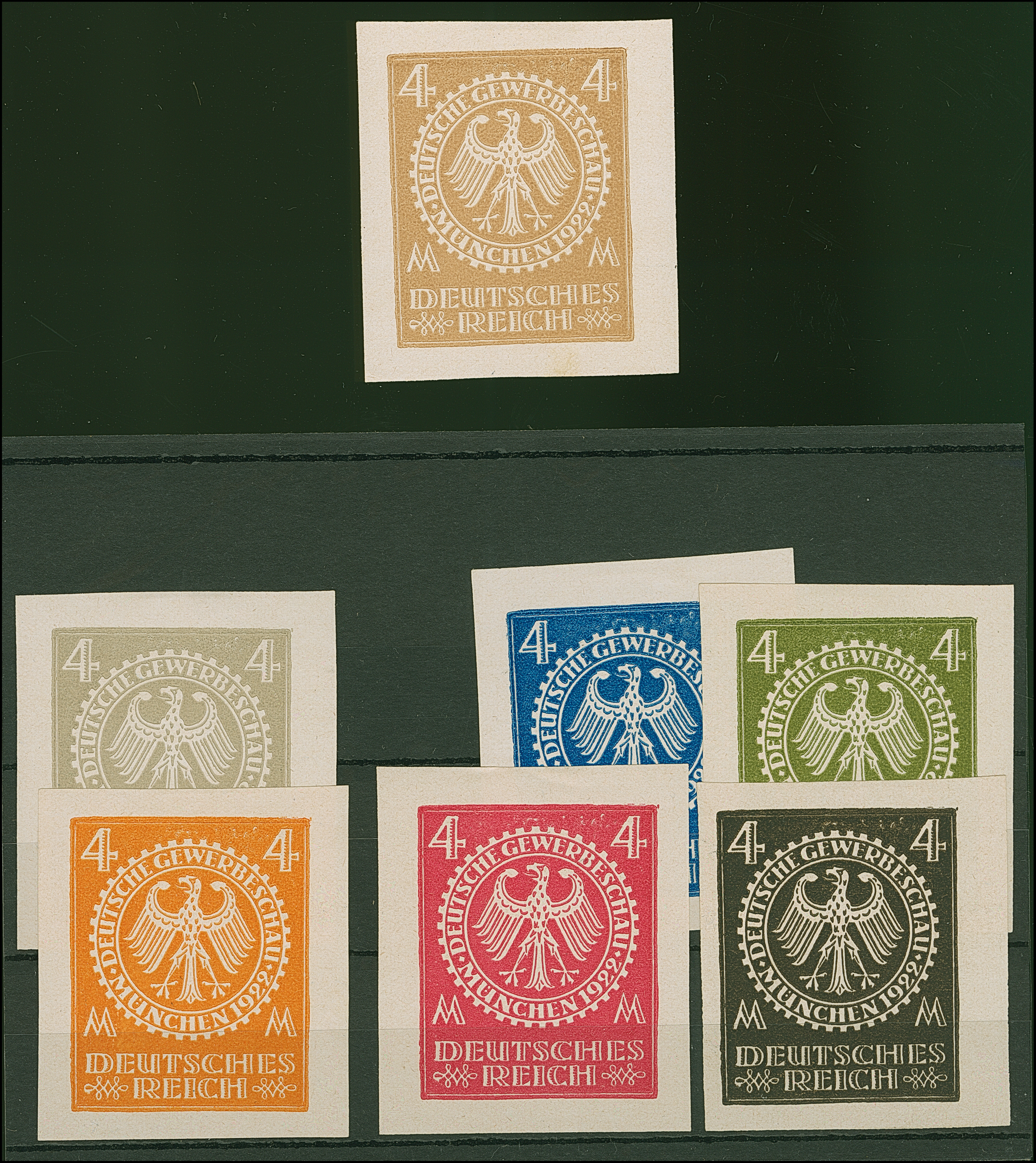 1922, Gewerbeschau München 20 Mark, sieben verschiedenfarbige ungezähnte Essays im Großformat auf Kunstdruckpapier ohne Gummierung, Falzrest, nach einem Entwurf von Prof. Ehmcke, in tadelloser Erhaltung