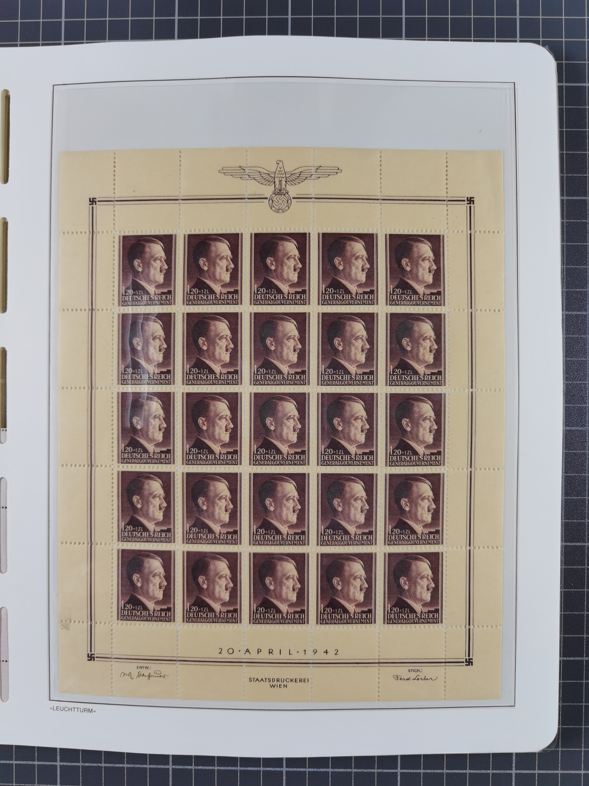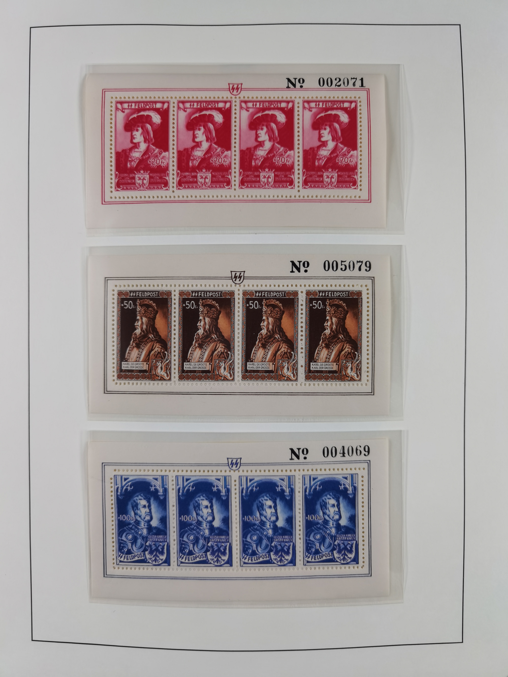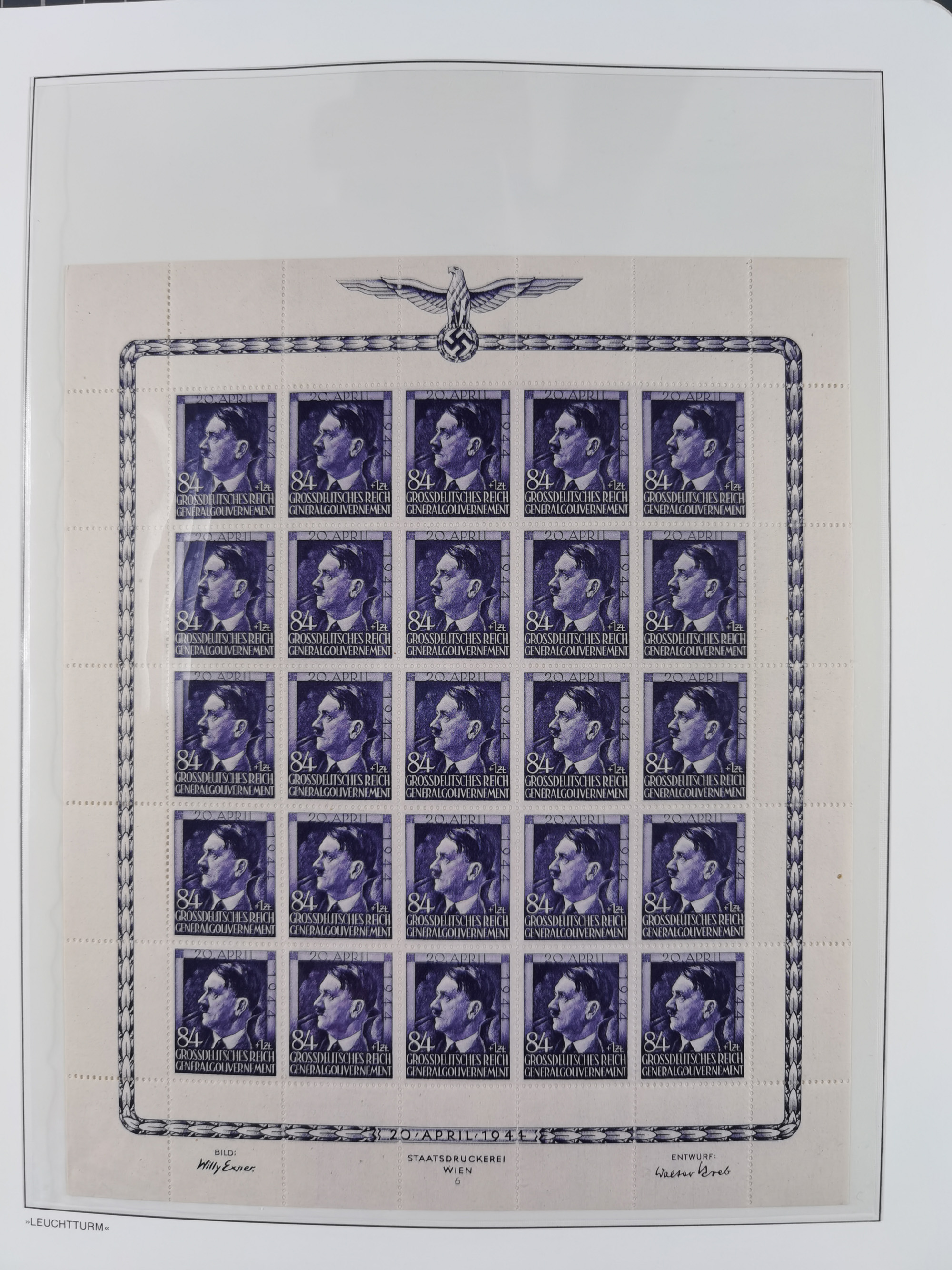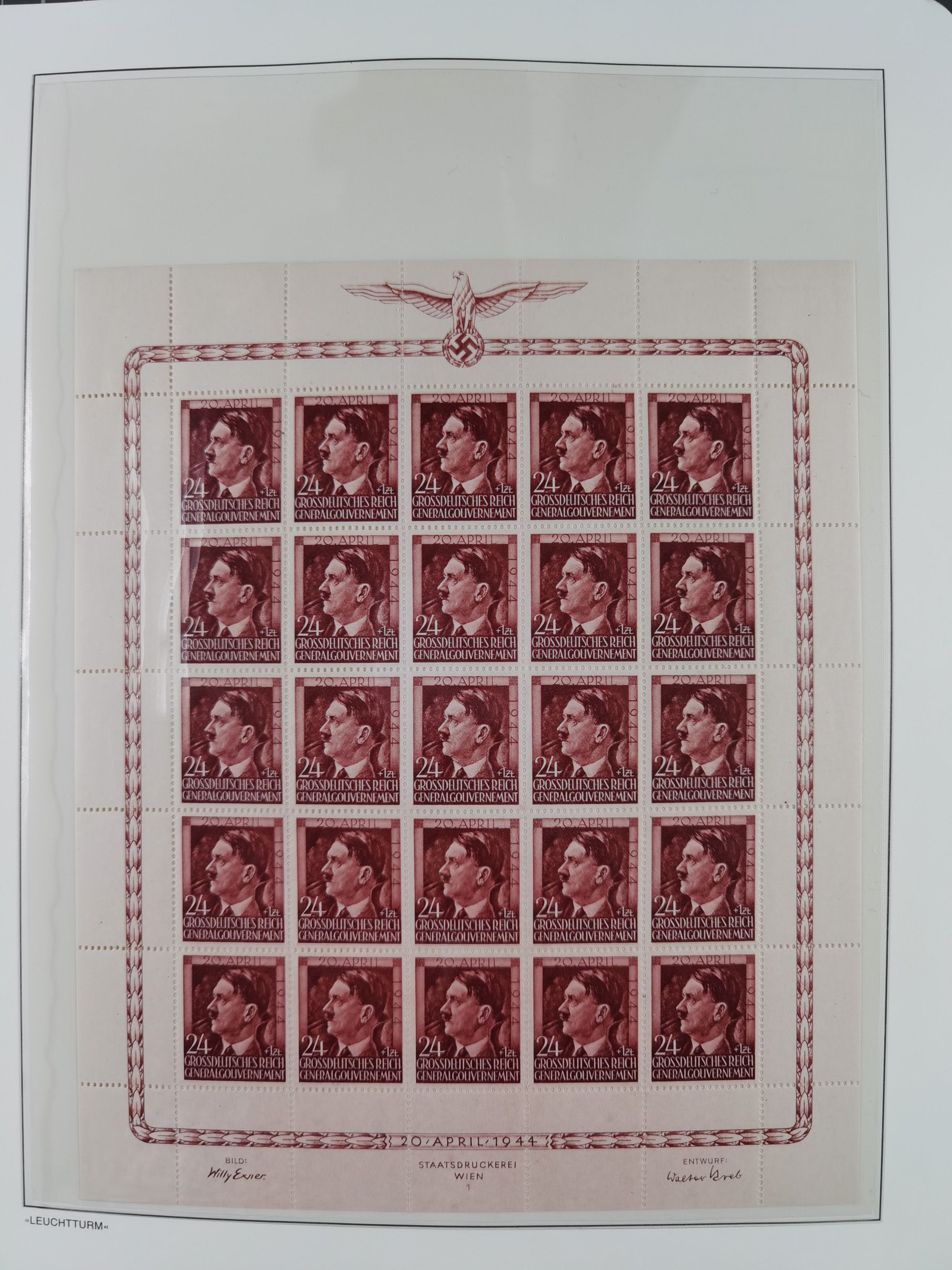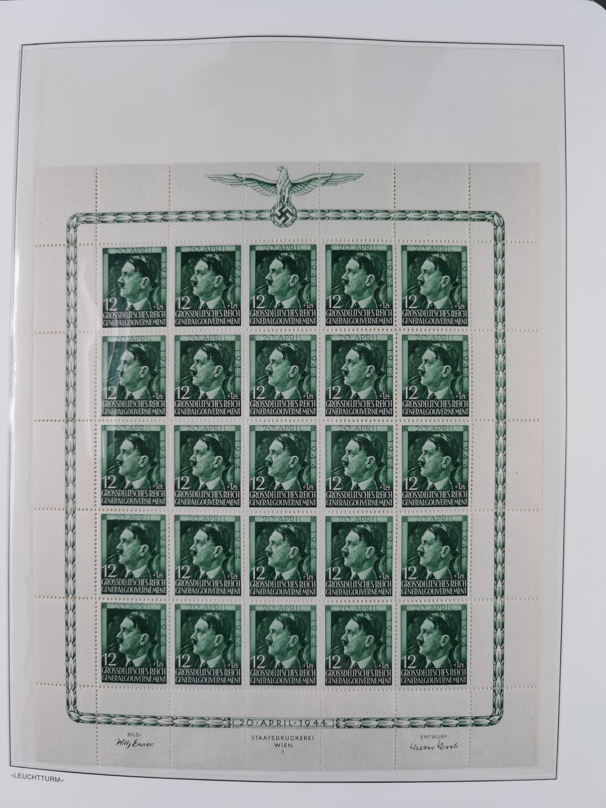 1942, Hitler 60 H., drei verschiedene Fotoessays, waagerecht nebeneinander gedruckt auf gestrichenem, ungummierten Papier (179x100mm), tadellos, sehr attraktiv, in dieser Form haben wir kein weiteres Stück registriert, sign. Gilbert sowie Fotoattest Brunel (2025)