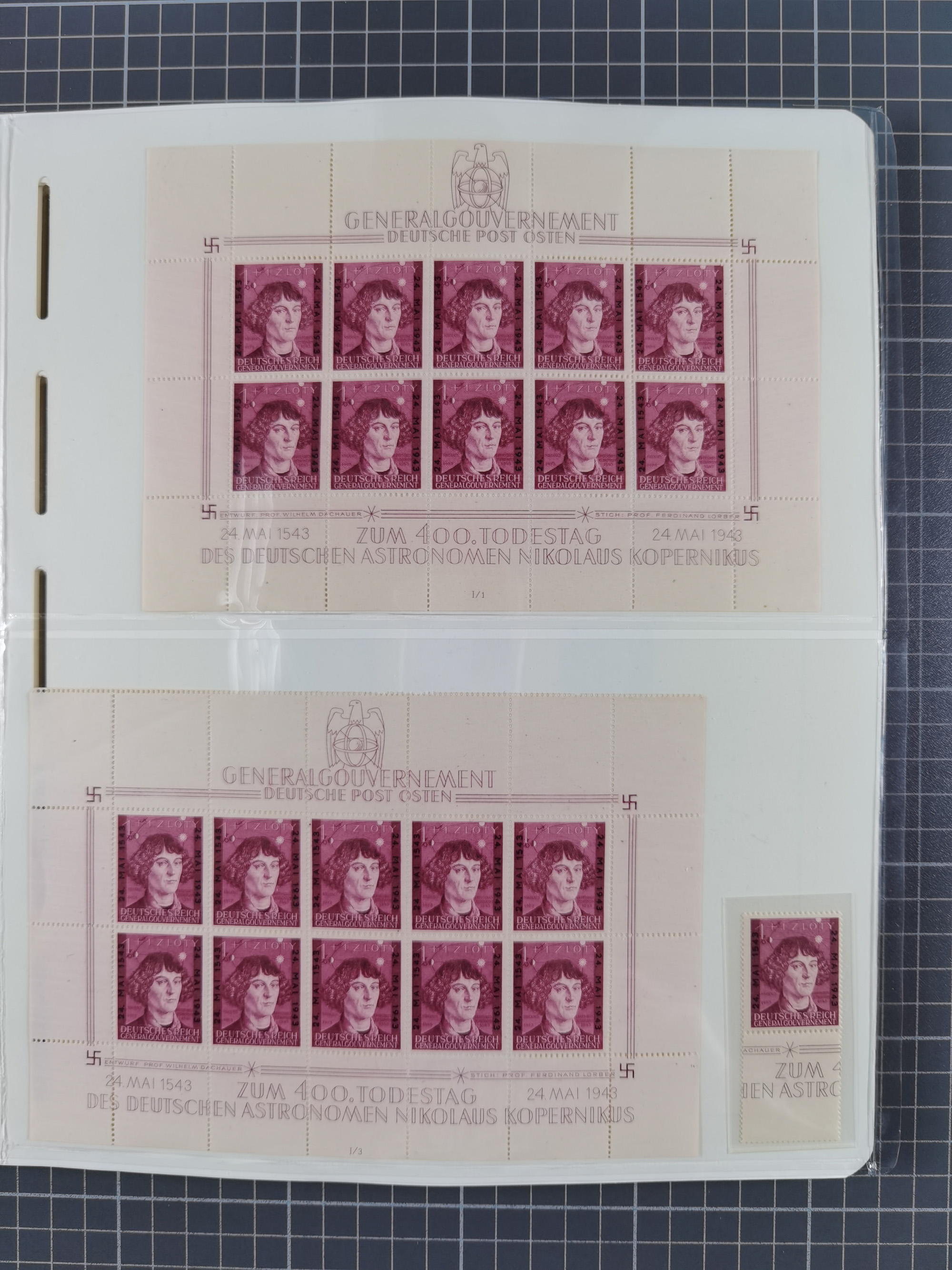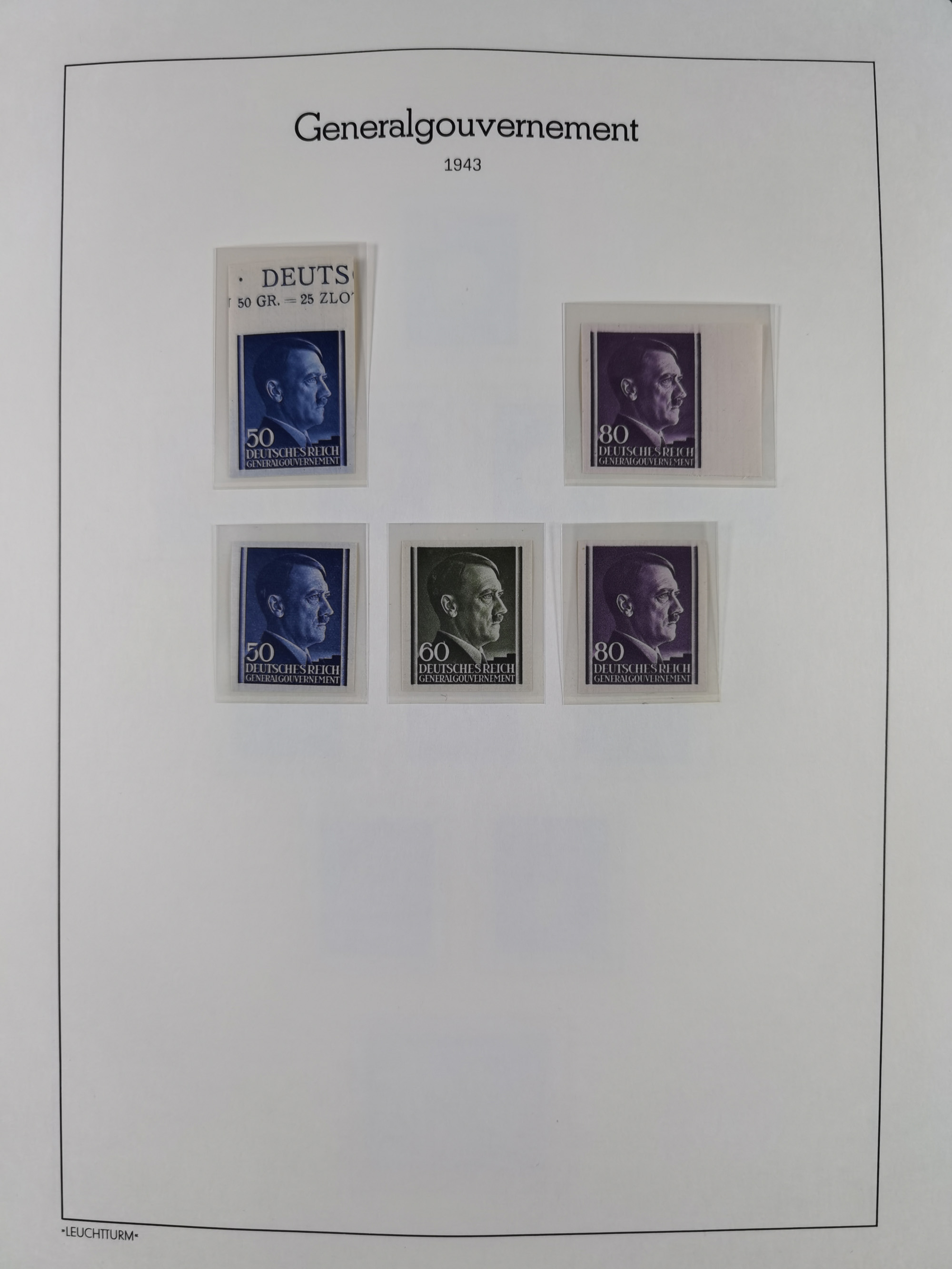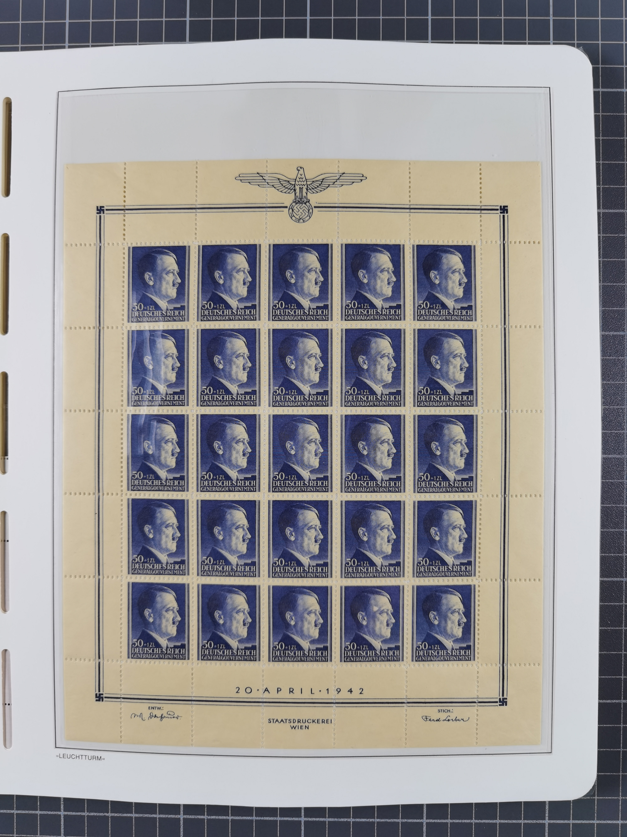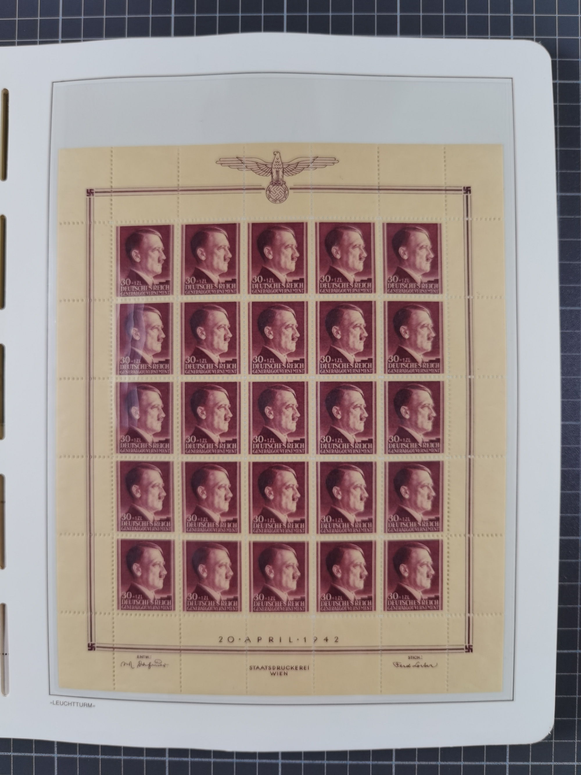 1942, Hitler 60 H., drei verschiedene Fotoessays, waagerecht nebeneinander gedruckt auf gestrichenem, ungummierten Papier (179x100mm), tadellos, sehr attraktiv, in dieser Form haben wir kein weiteres Stück registriert, sign. Gilbert sowie Fotoattest Brunel (2025)