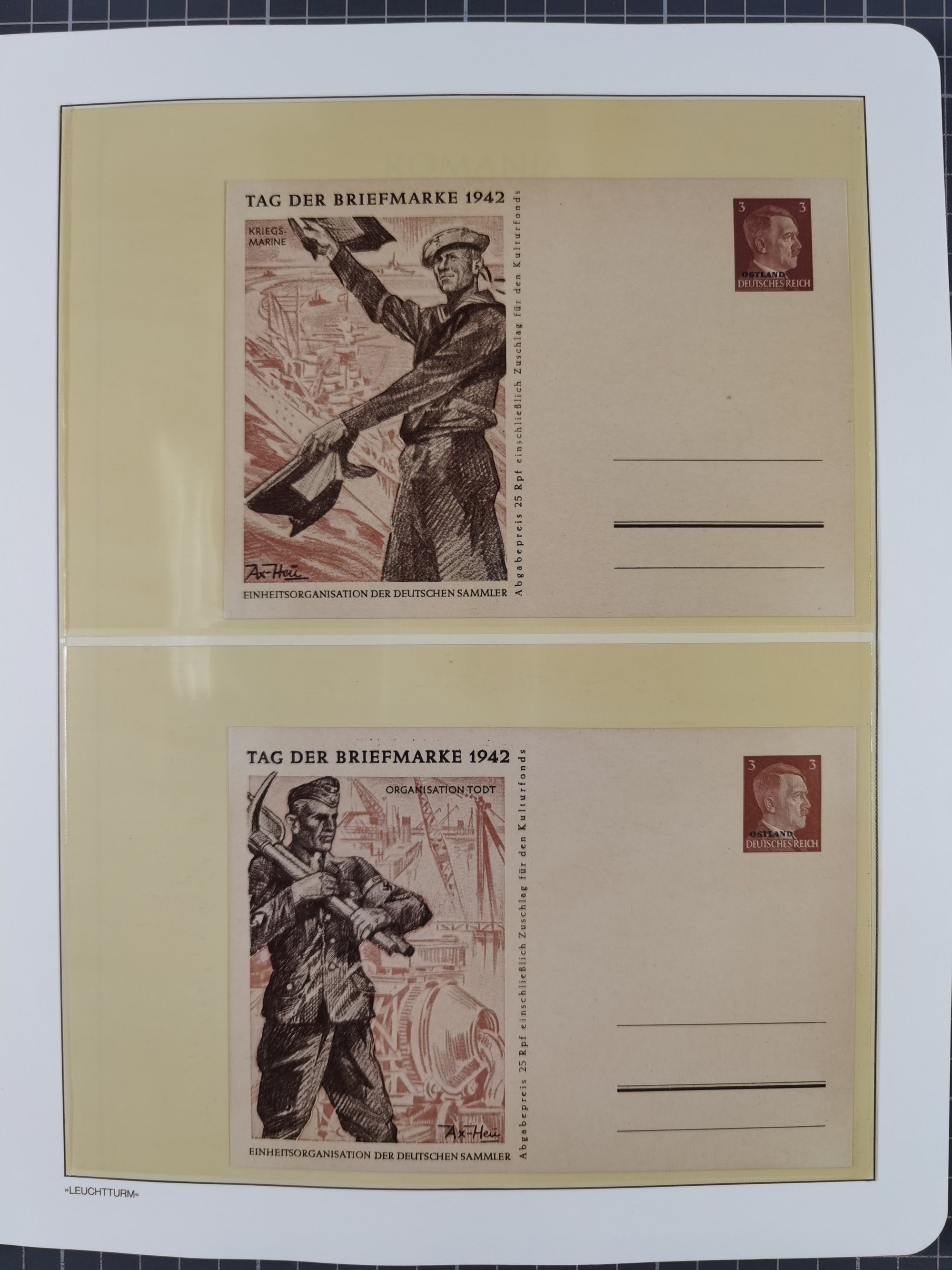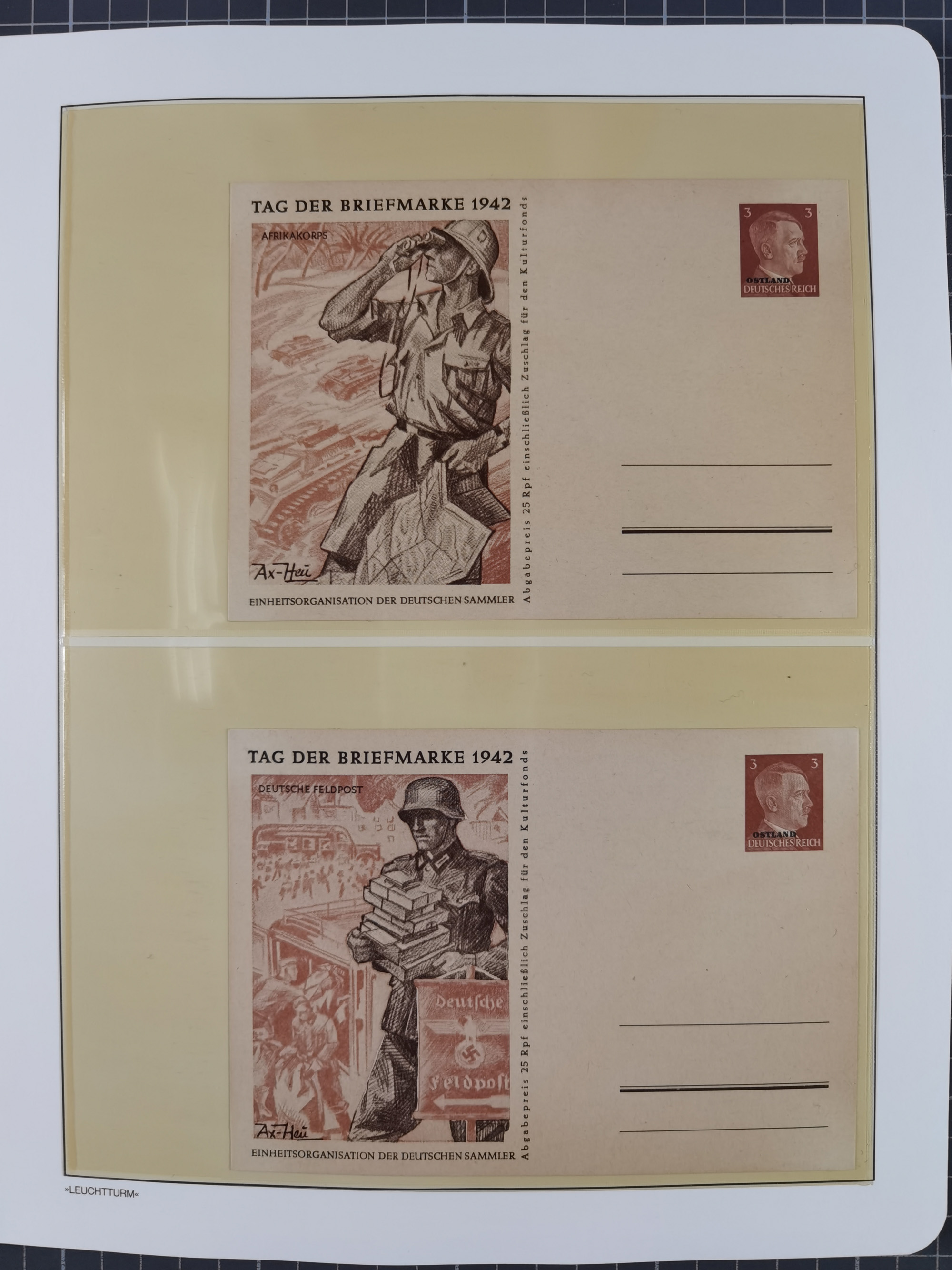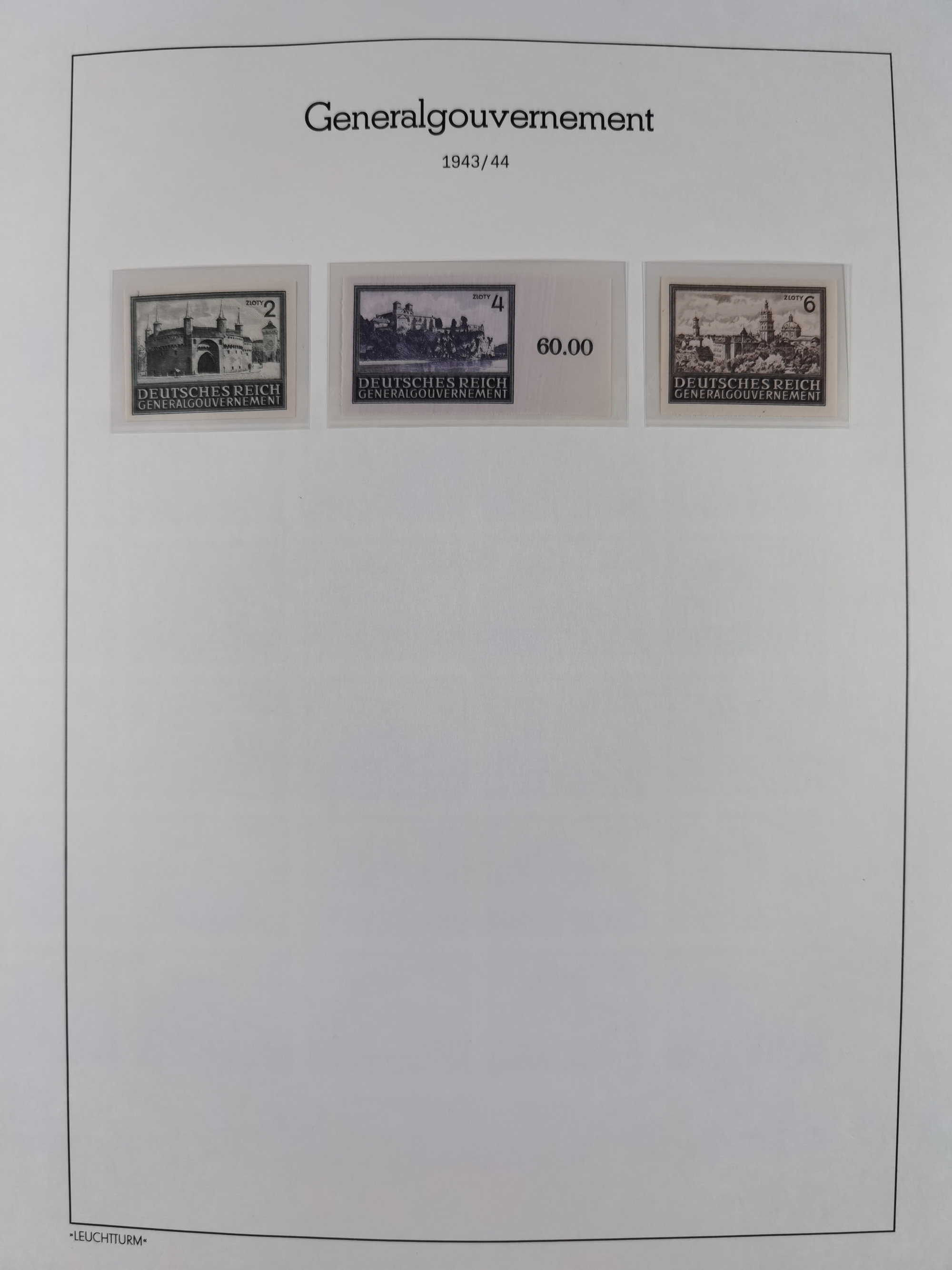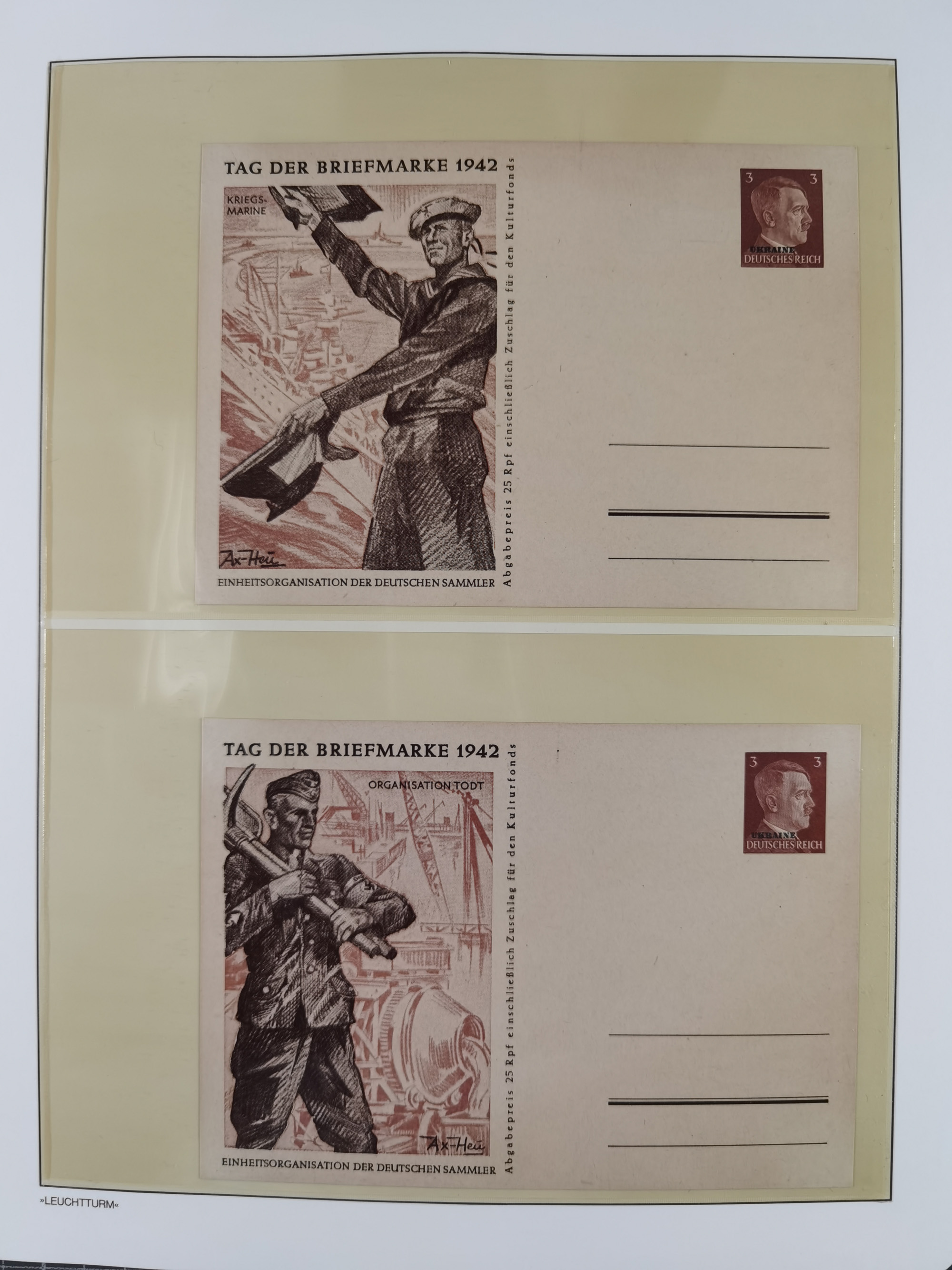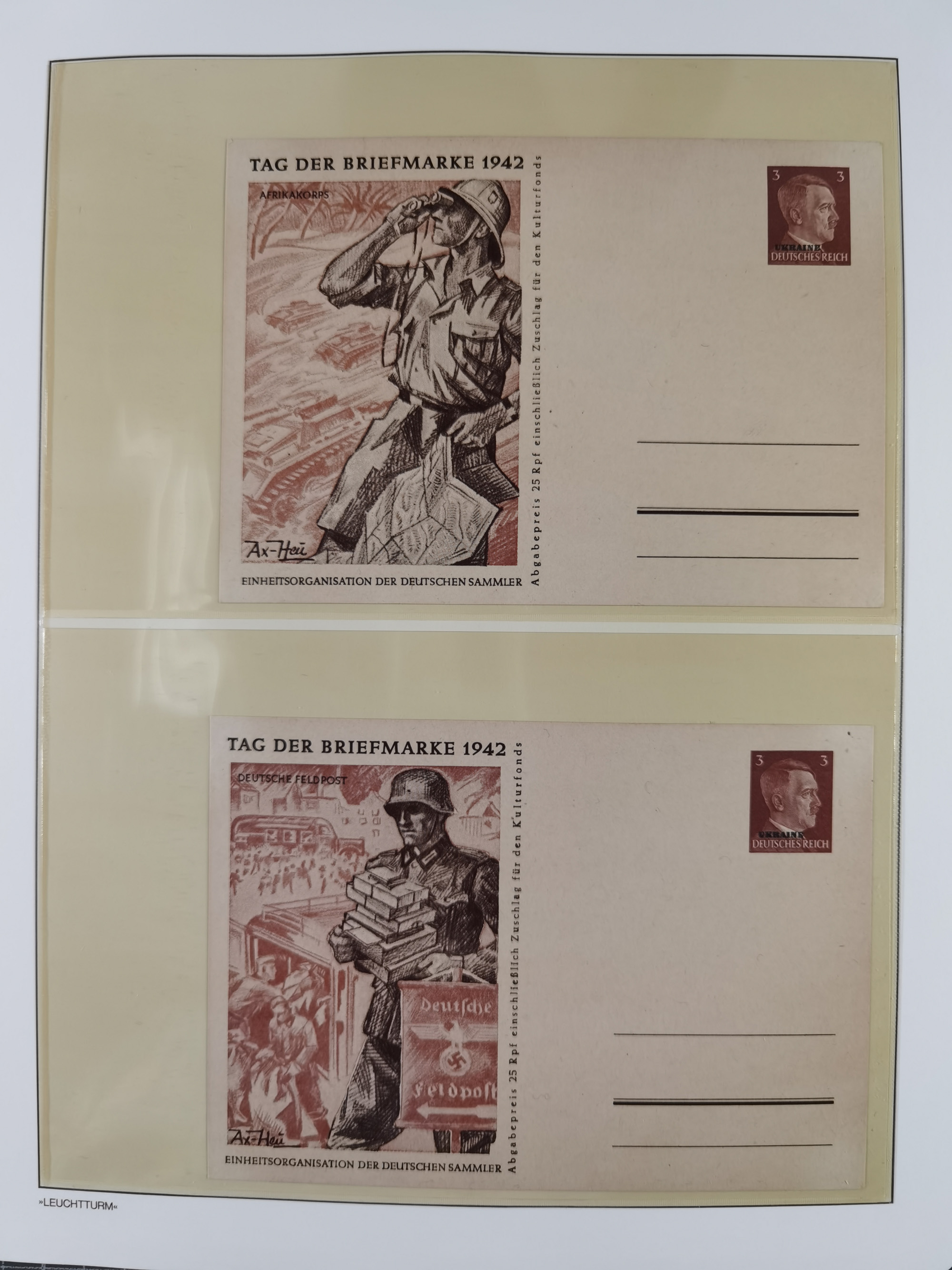 1942, Hitler 60 H., drei verschiedene Fotoessays, waagerecht nebeneinander gedruckt auf gestrichenem, ungummierten Papier (179x100mm), tadellos, sehr attraktiv, in dieser Form haben wir kein weiteres Stück registriert, sign. Gilbert sowie Fotoattest Brunel (2025)
