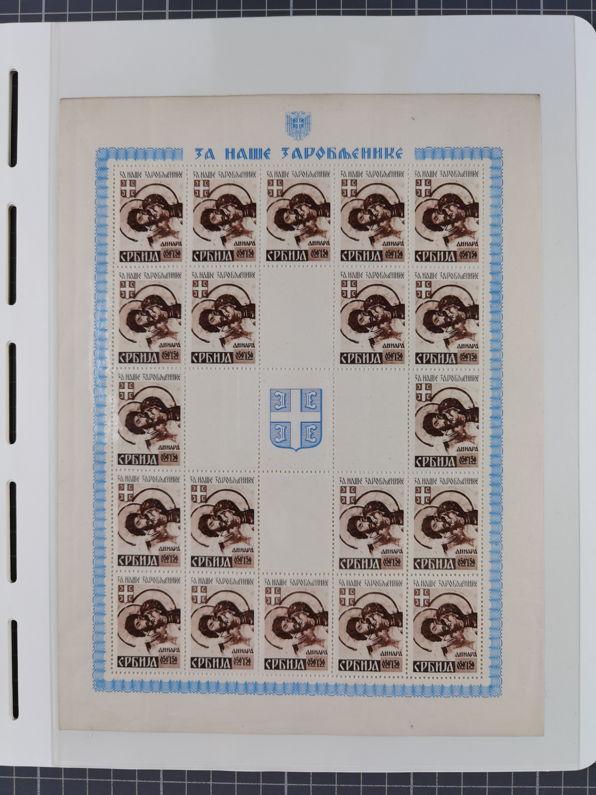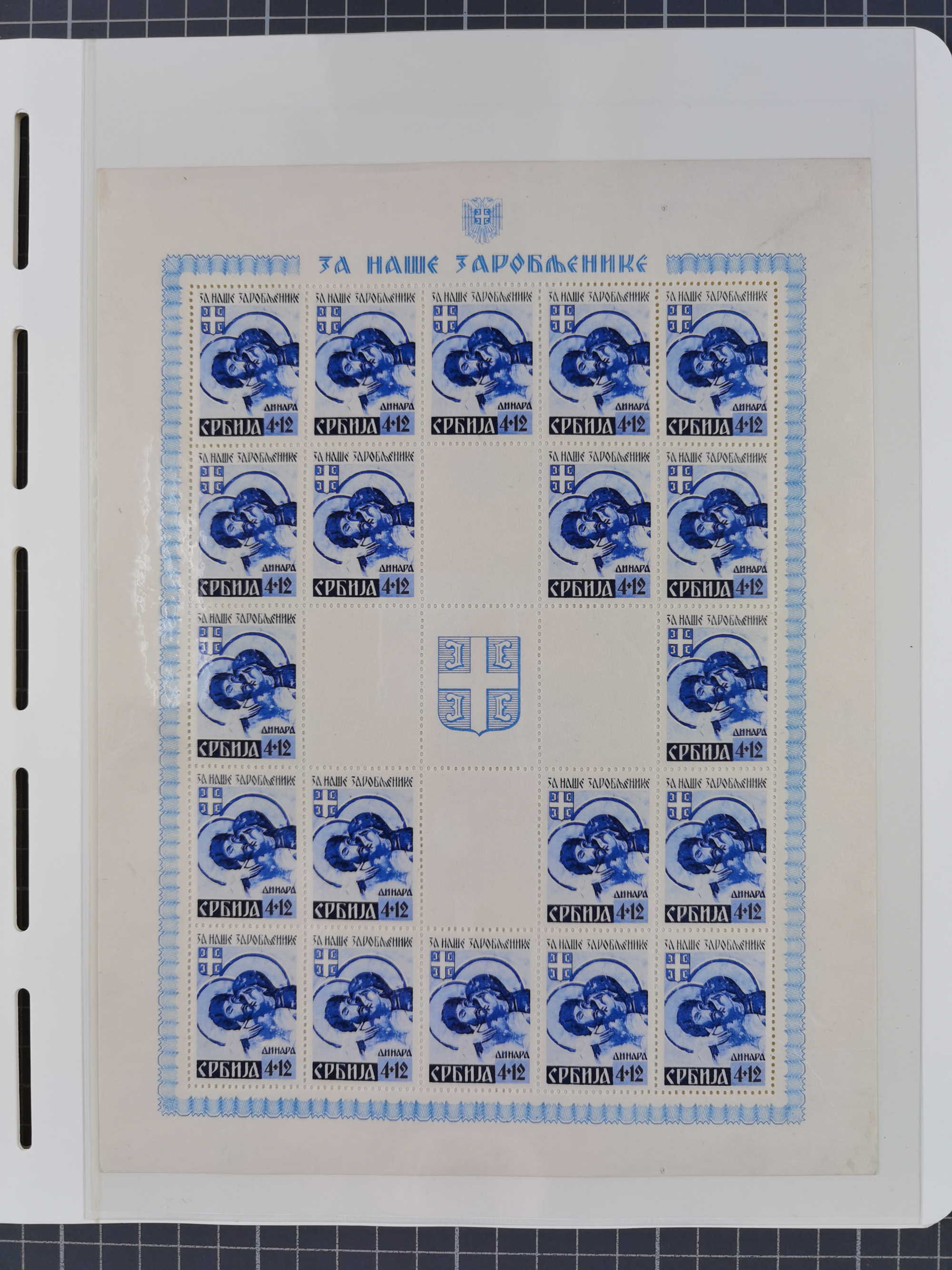 1940, Rotes Kreuz 1,20 K. blaugrün mit Zierfeld rechts, Farbprobedruck im Kleinbogenformat, sauber in Passepartout montiert, rückseitig auf dem Passpartout Nummerierung “4” sowie Bleistiftnotiz “…Erhalten von Postrat Hroch.”, tadellos, sehr attraktiv und sehr selten, Fotoattest Pfeiffer BPP (2019)