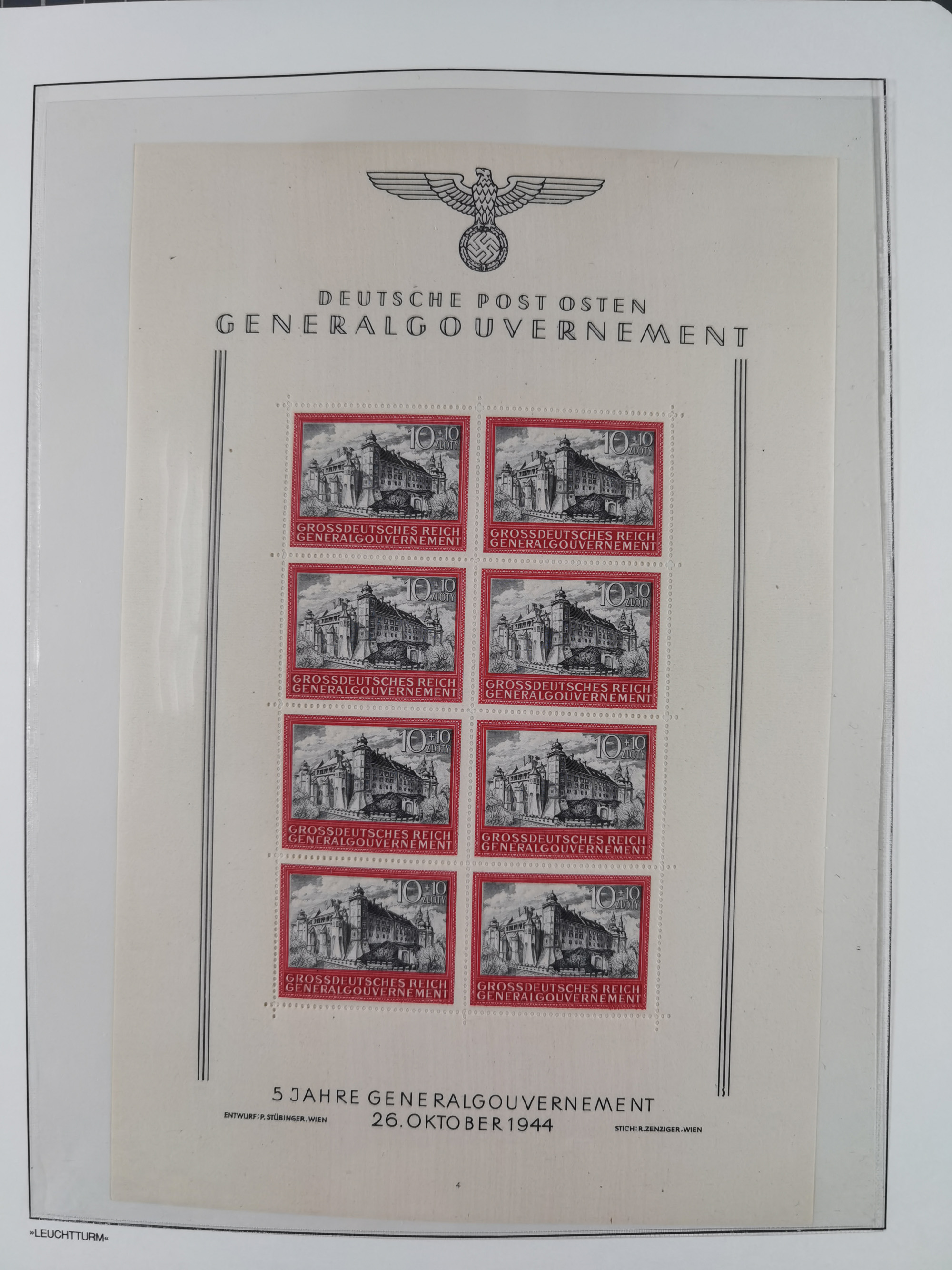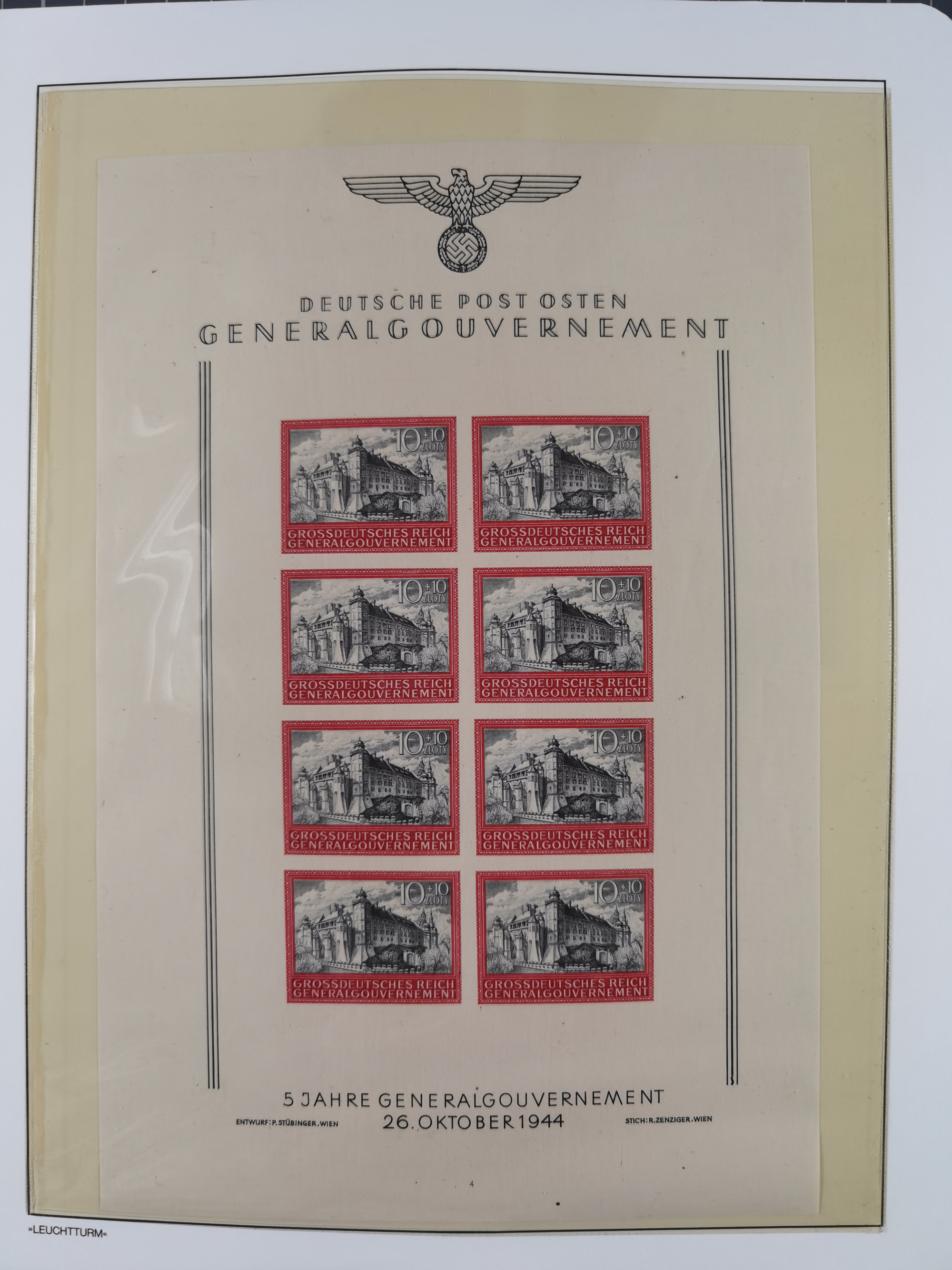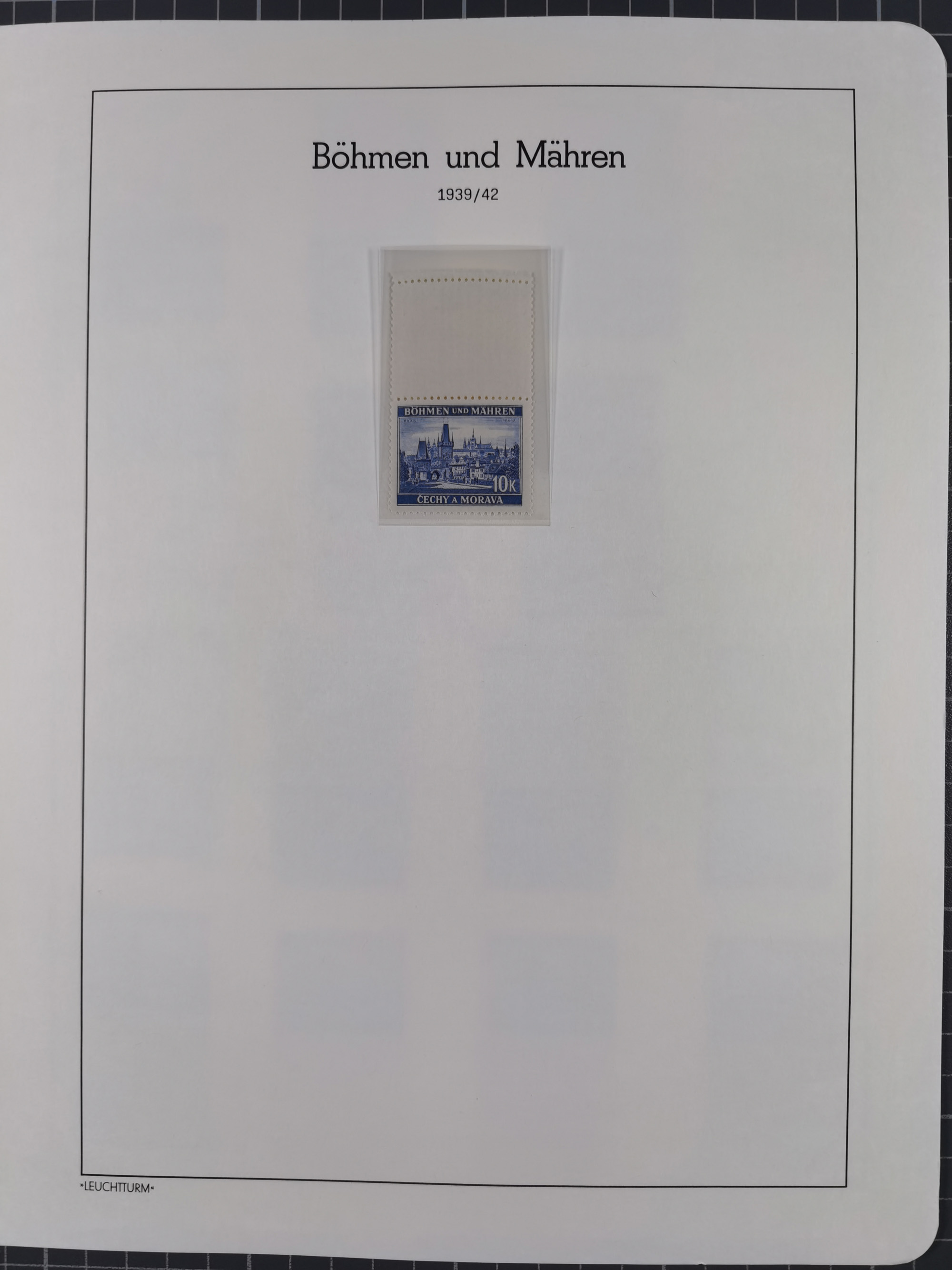 1940, Waldstein-Palais Prag 10K., dunkelblau, Einzelabzug in abweichendem Format, die Schriftleisten sind nicht vollständig ausgearbeitet und weisen einen helleren Farbton auf, auf ungummiertem Papier (81x66mm), tadellos, sehr selten, Fotoattest Brunel (2019)