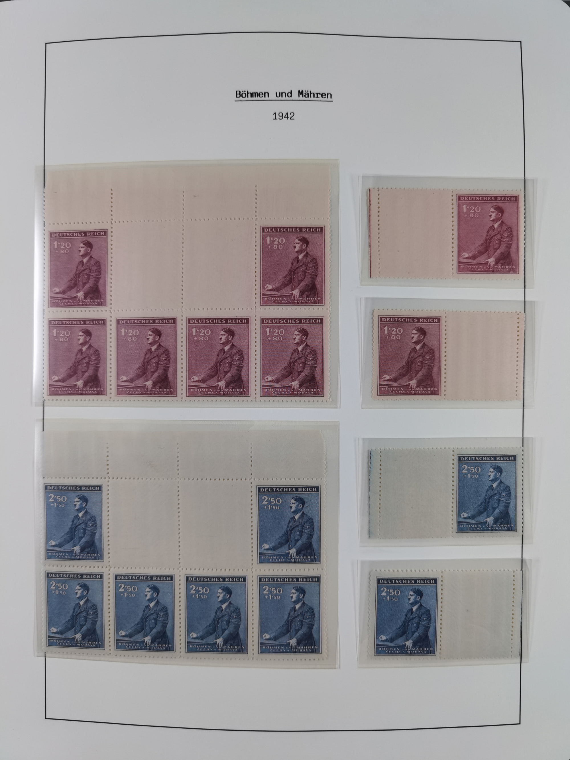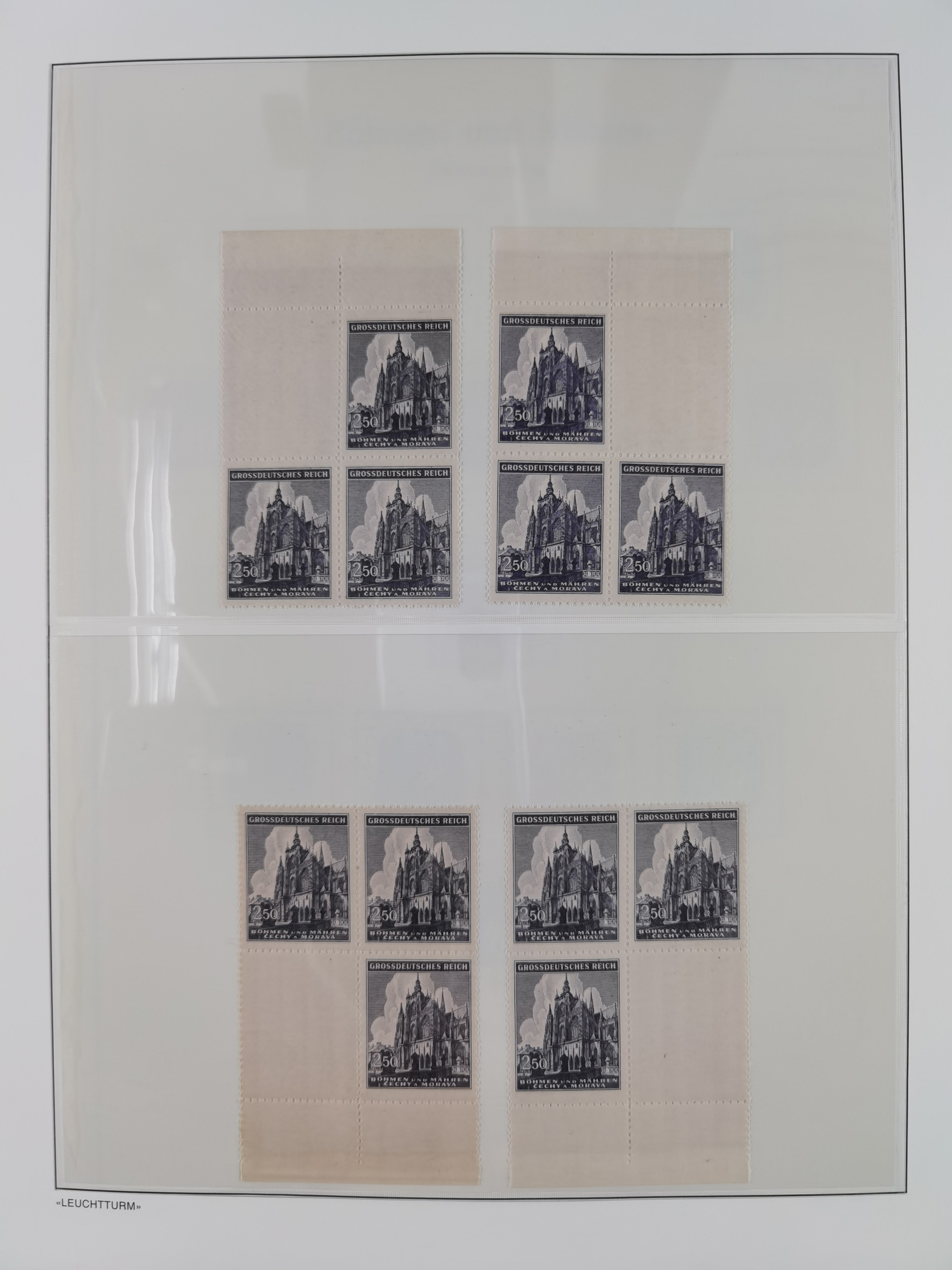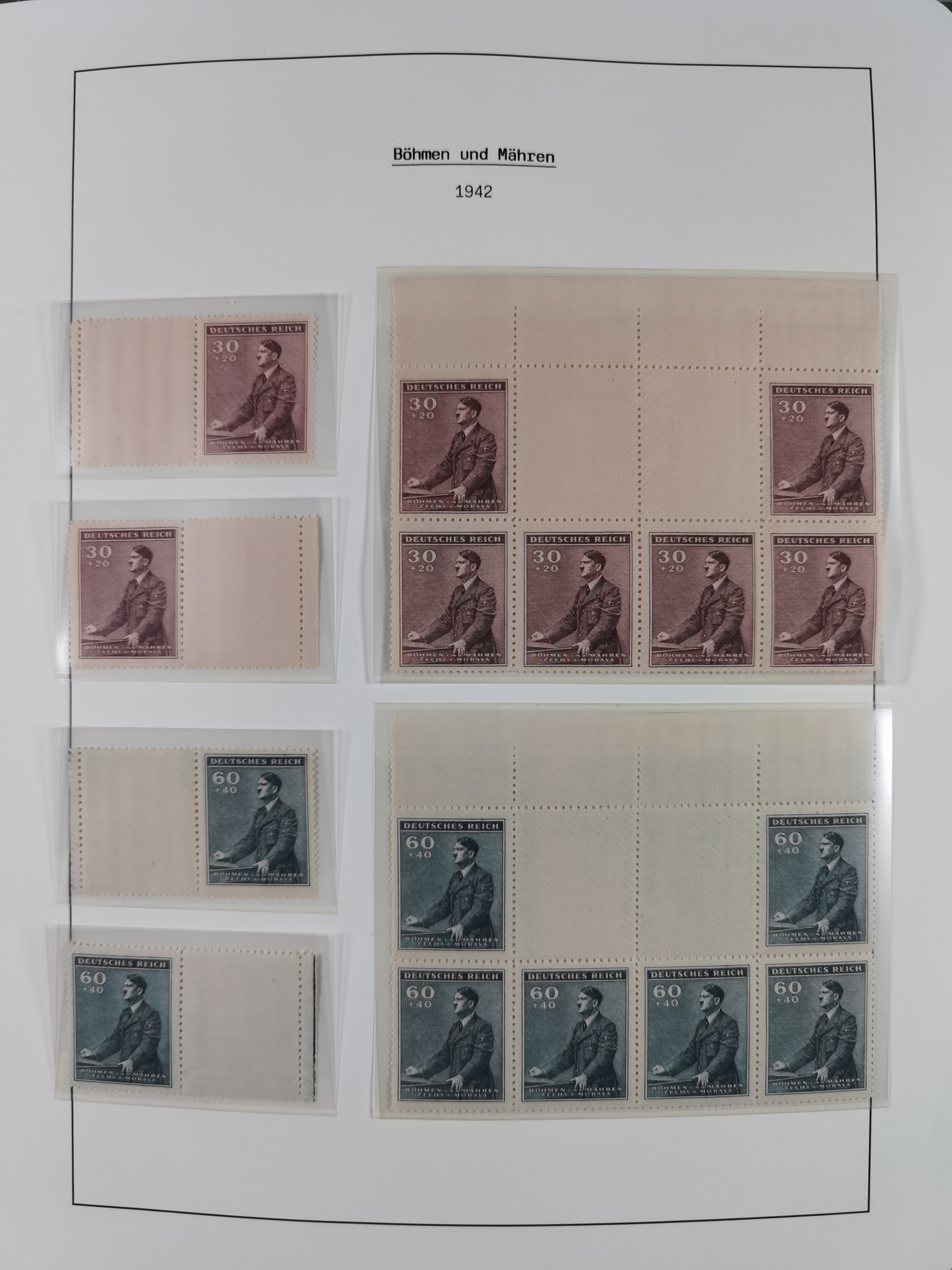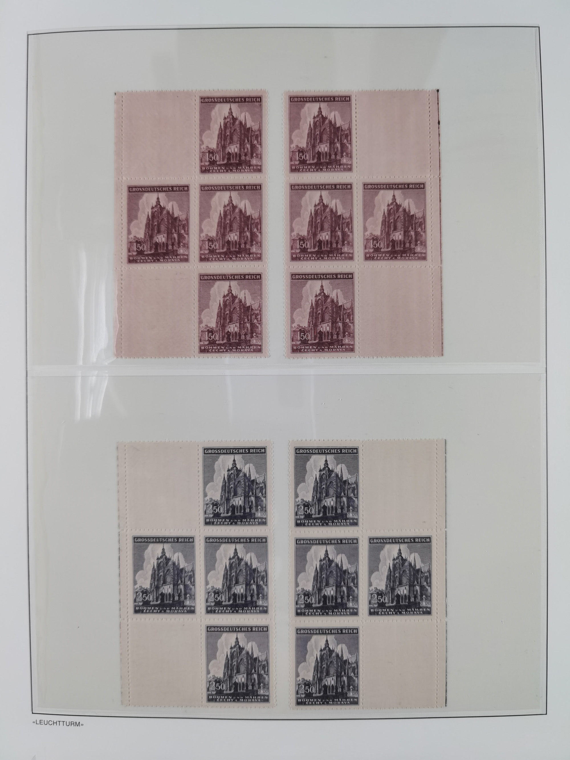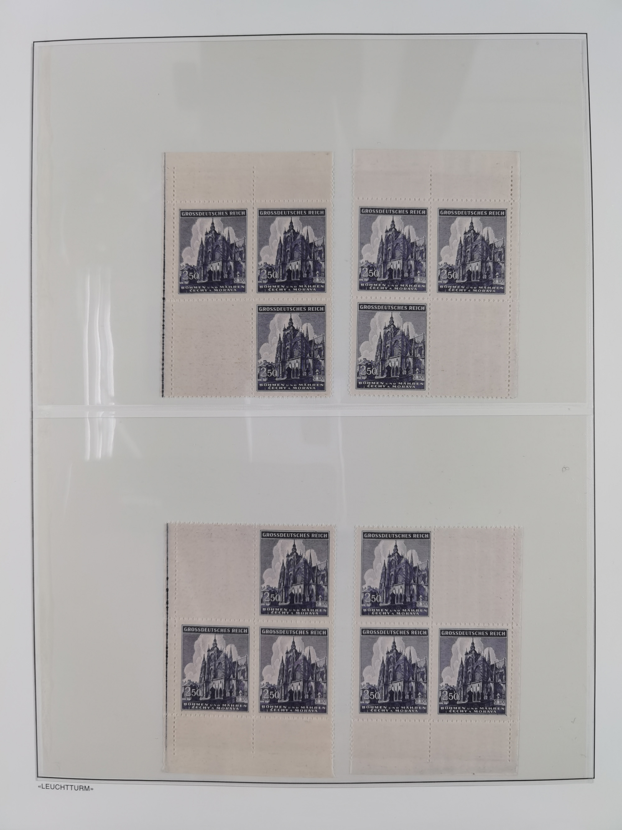 1939/45, sehr reichhaltige, postfrische Sammlung im dicken Leuchtturm-Album mit vielen Besonderheiten, dabei Eckrandstücke mit Plattennummer sowie Marken mit anhängendem Leerfeld, große Stückzahl an Viererblocks mit Plattennummern bei den Zeitungsmarken und Dienstmarken; bei den Portomarken Eckrandstücke mit Plattennummer und waagerechte Zwischenstegpaare mit Plattennummer, viel ex Mi.-Nr. 1-19, zu guter Letzt Zulassungsmarke Theresienstadt mit Fotoattest Brunel, alles in sehr schöner Erhaltung