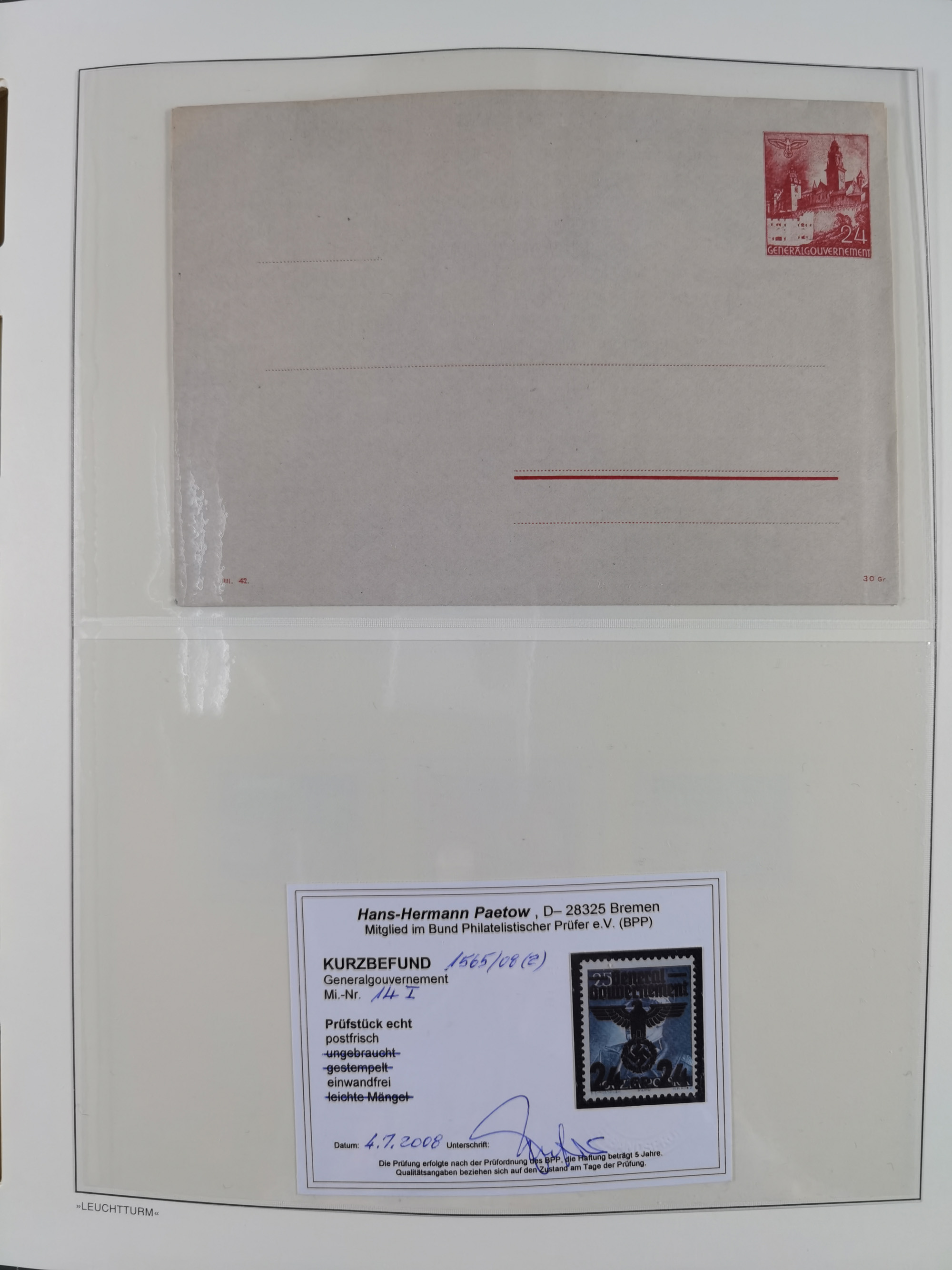 1942, Hitler 1-2,40K., Einzelabzug (57x75mm) auf ungummiertem Papier, in von der endgültigen Ausgabe etwas abweichendem Format, die obere Schriftleiste ist nicht vollständig ausgearbeitet, die Schraffur des Bildhintergrundes weicht von den ausgegebene Werten ab, tadellos, sehr selten, Fotoattest Brunel (2025)