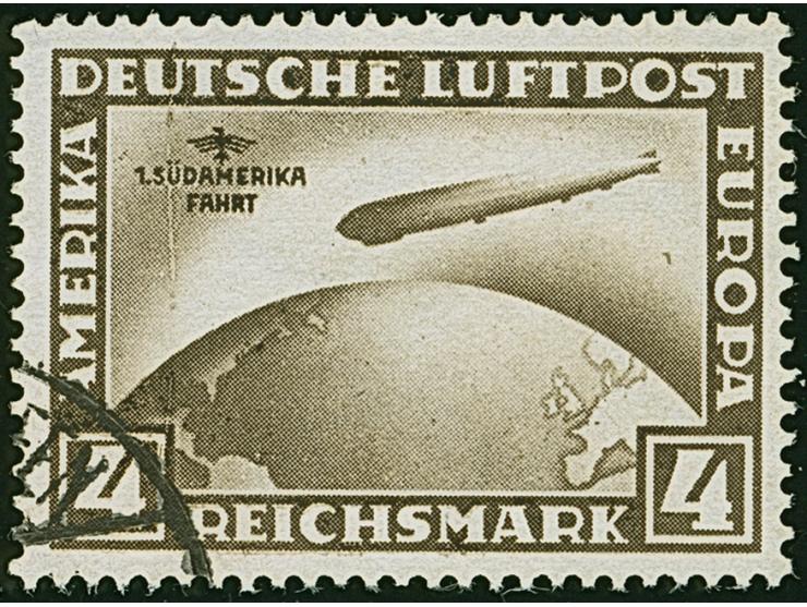 1930, Südamerikafahrt 4 RM. schwarzbraun mit seltener Abart "BLITZ NEBEN ADLER", mit liegendem Wasserzeichen, sauberer Teilstempel Friedrichshafen, farbfrisch und gut gezähnt, einwandfrei