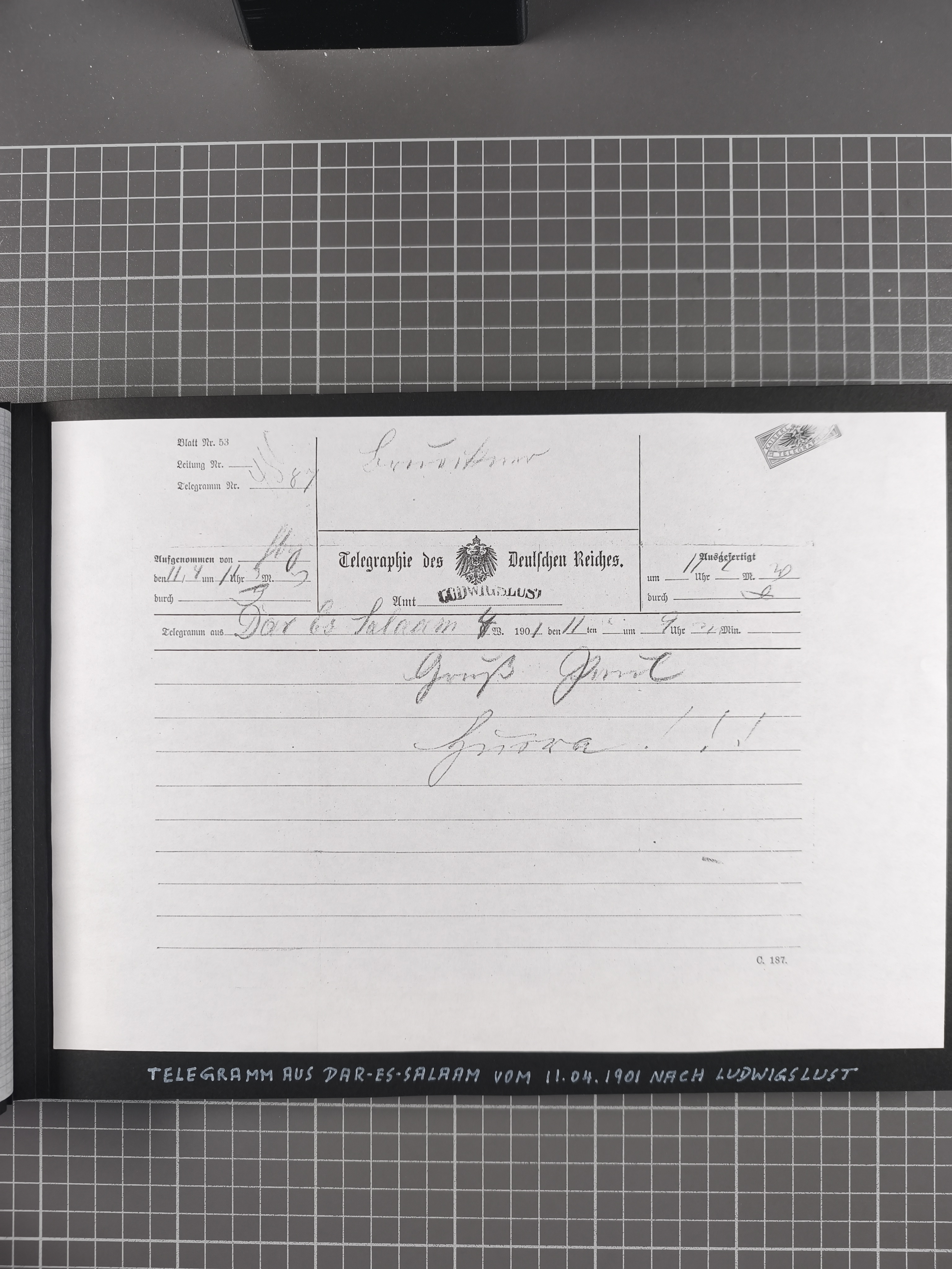 1892/1916, Partie mit 16 Briefen, Karten und Ganzsachen sowie ein Telegramm und zwei linken Postanweisungs-Abschnitten mit schriftlichen Mitteilungen, dabei u.a. Reichsdienstsachen-Umschlag 1892 an Carl Petes, GSK 1900 als Inlandskarte aus dem Bedarf nach Snongea mit Ankunftsstempel, frankierter Brief 1912 nach Schweden mit Nachsendung, überfrankierter R-Ortsbrief Daressalam 1913 an einen Passagier der Adolph Woermann und Feldpostbrief 1916. Alle Belege auf Albenblättern mit genauer Beschreibung und meist in guter Erhaltung