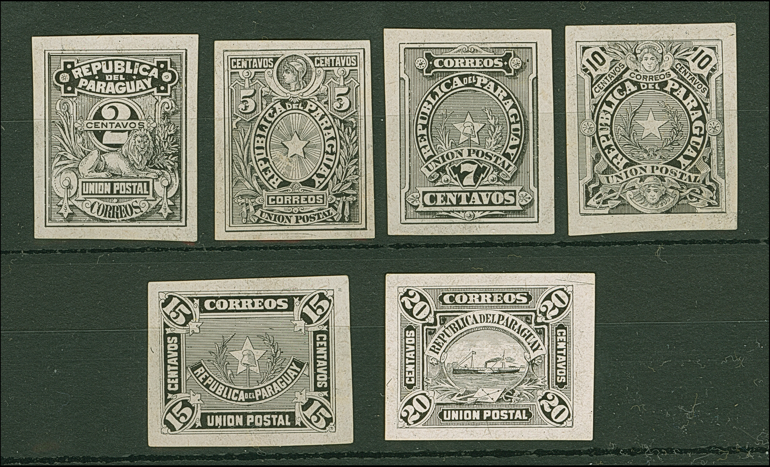 1886, Official Stamp essays without the Official overprint, 2 c., 5 c., 7 c., 10 c., 15 c. and 20 c., all in black on thin paper, very fine