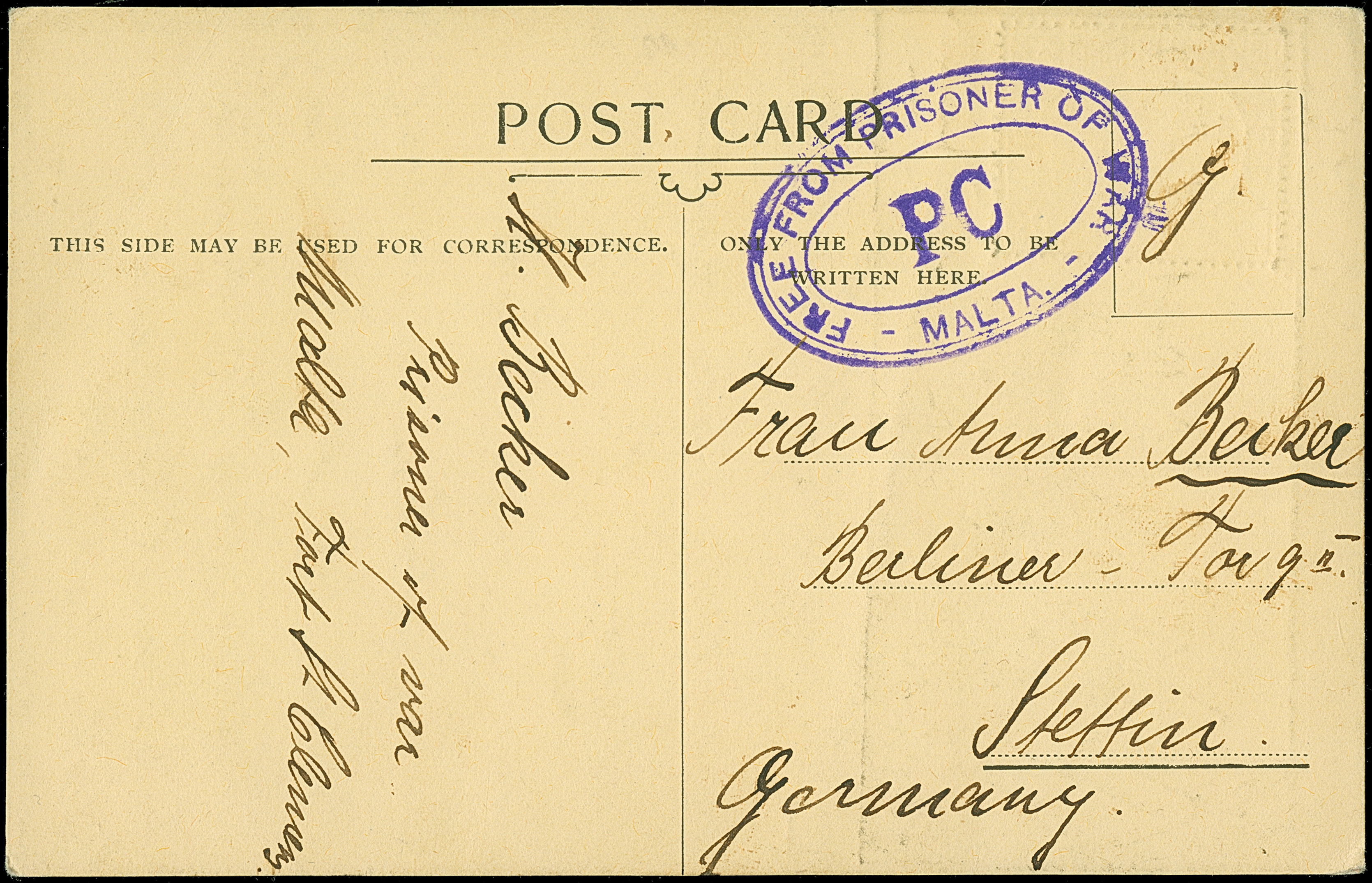 1915, Malta First World War Prisoner of War Mail: Maximum Card style olive-brown impressed ´kamp post/malta´ stamp on reverse of card to Stettin Germany. Shows on front the fine violett strike "Free from Prisoner of war MALTA PC", fine and unusual.