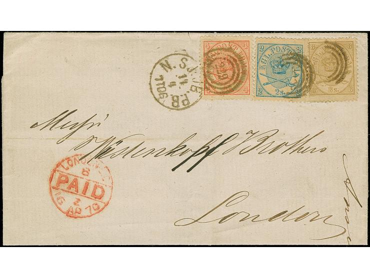 1864, 2 sk. blue, 4 sk. red and 8 skilling ocre, tied by duplex "229/N.SJ.JB.P.B. 14/4"(1870) to letter sheet to London. Fine and attractive. Certificate Lasse Nielsen (2003).