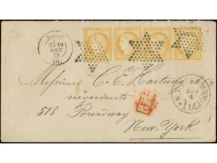 1873, Ceres 15 c. yellowish-brown two pairs, performing 60 c. rate, tied to envelope by Paris Star cancellation, red PD and PARIS 19/AOUT/73 cds. in black alongside, addressed to New York with arrival mark N.Y. STEAMSHIP 10 SEP/4 on front, very fine and attractive.